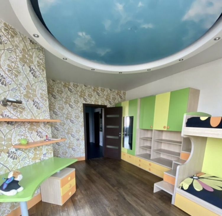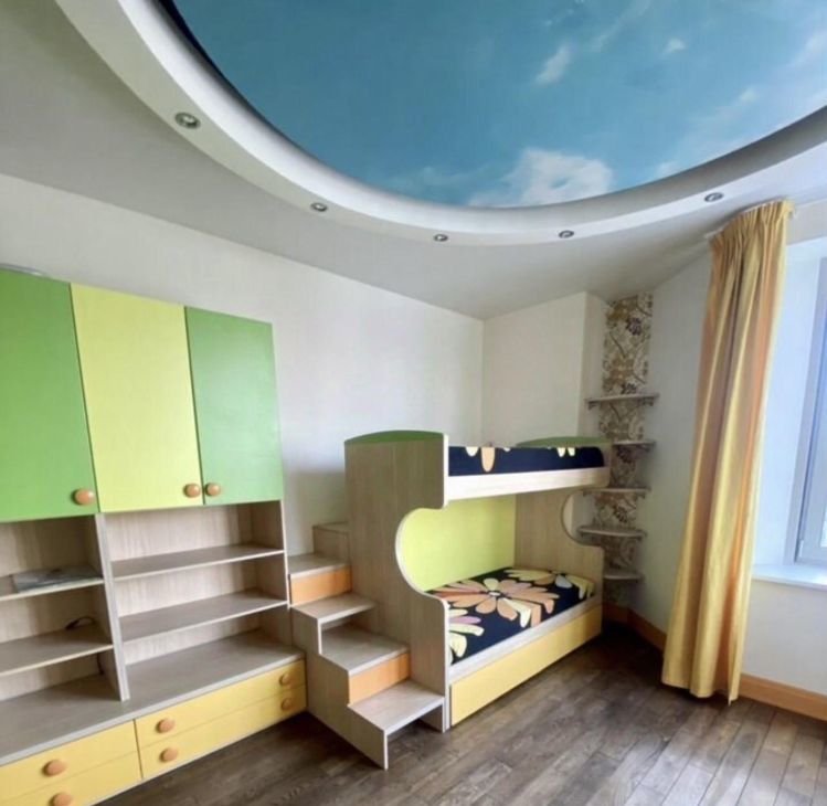 Детская комната рассчитана на проживание двух детей. Встроенная итальянская мебель позитивной жизнерадостной расцветки подходит как для мальчиков, так и для девочек. Двухъярусная кровать с подиумом на втором ярусе. Стол.