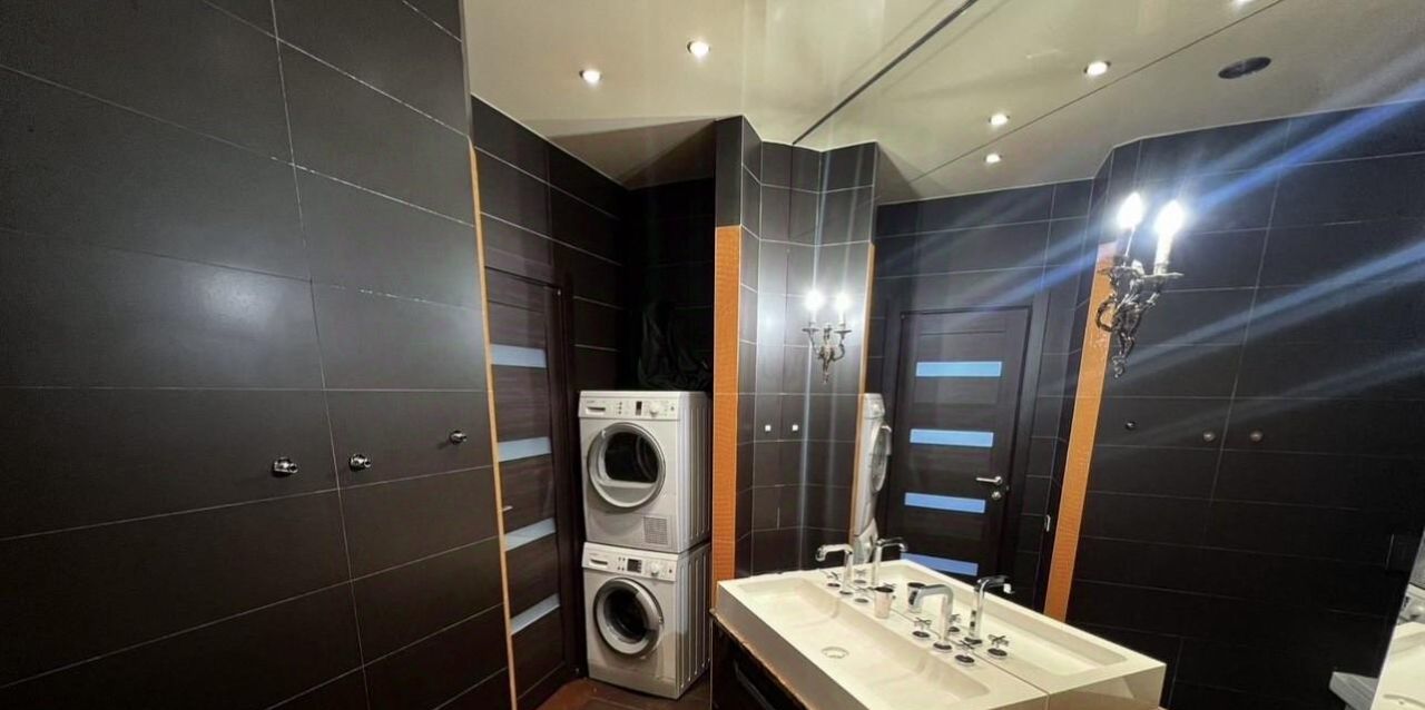 Стиральная машина, сушильная машина, микроволновая печь, телевизор, встроенный пылесос, пневмосовок на кухне.