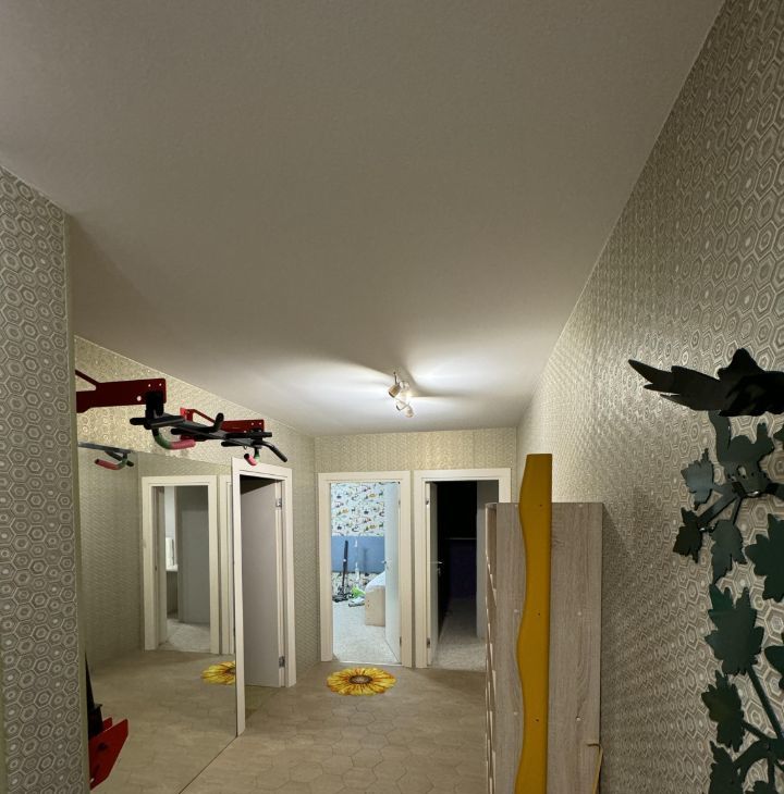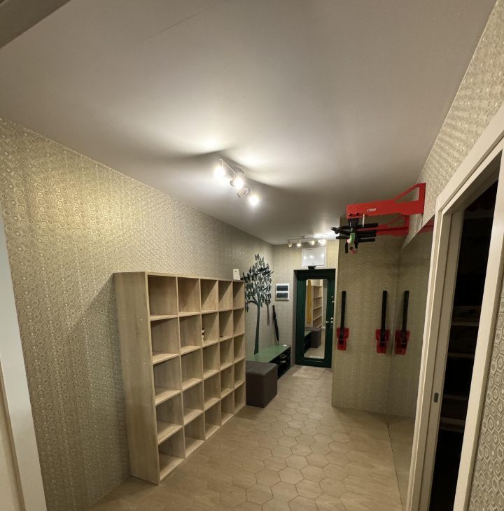 Шумоизоляция пол-потолок-стены к соседям. Мебель. Техника. Спортивный уголок (турник-брусья). Кровать-дом для малышей. В квартиру заведен интернет (МТС и Норснет) нужно только заключить договор. Есть гардеробная. Большой балкон с системой сушки белья. Теплые полы (кухня и коридор). Оплата по договору на ИП. Аренда + счётчики.