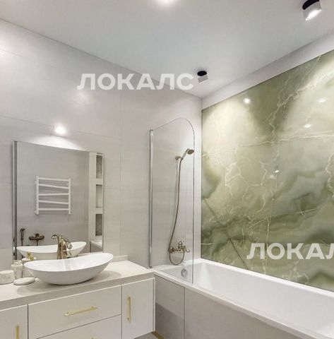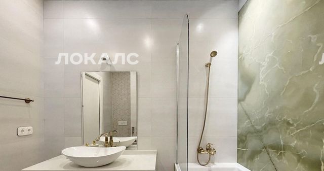 В квартире две ванные комнаты: одна с ванной, другая с душевой кабиной. Полы в обеих оборудованы подогревом, а основная ванная дополнительно украшена стеной из натурального зелёного оникса.