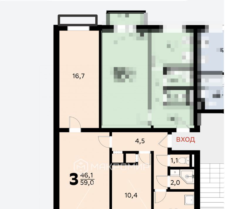 • Общая площадь 59 кв.м., жилая 46,5 кв.м.