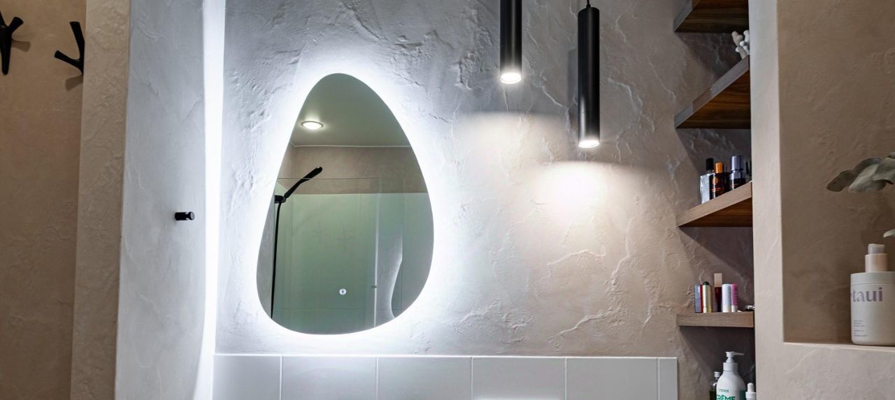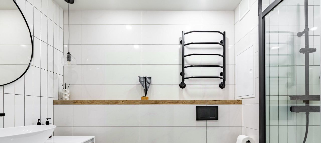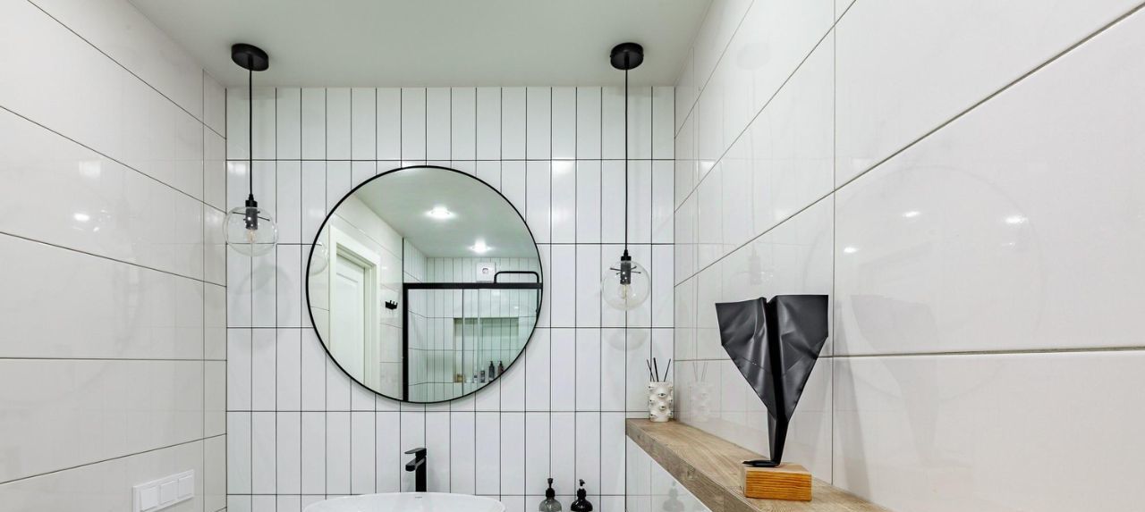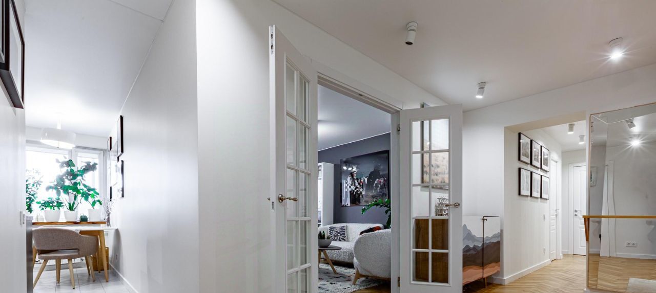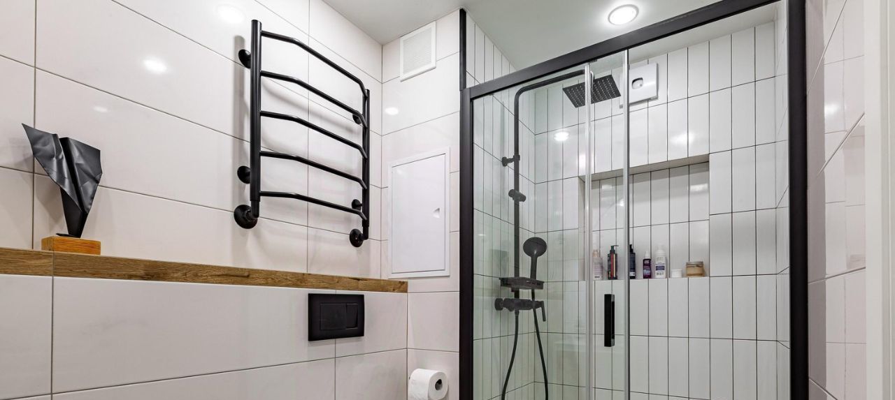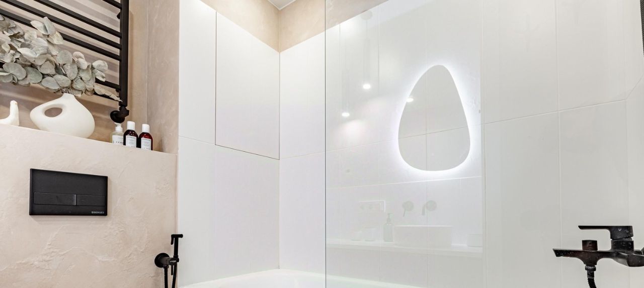 Стены под покраску и выведены 90 градусов. Напольное покрытие: инженерная доска и паркет в гостиной. Санузлы — плитка и декоративная штукатурка. Отличные встроенные шкафы в жилых комнатах и коридоре, где включен постирочный блок под вертикальную установку сушильной и стиральной машин. Материалы: мдф + фасады Egger. В квартире есть два совмещенных санузла: в одном — ванна, а во втором — душевая.