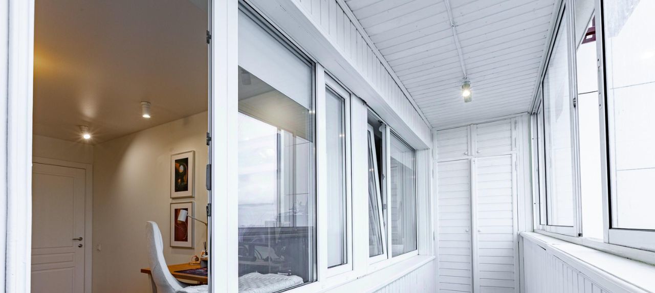 Квартира оснащена двумя лоджиями с организованной системой хранения (по два шкафа в каждой из них). Лоджии зашиты вагонкой, открывается вид на центр города и тихий двор. Нет прямого выхода окон на улицу, все через лоджии.