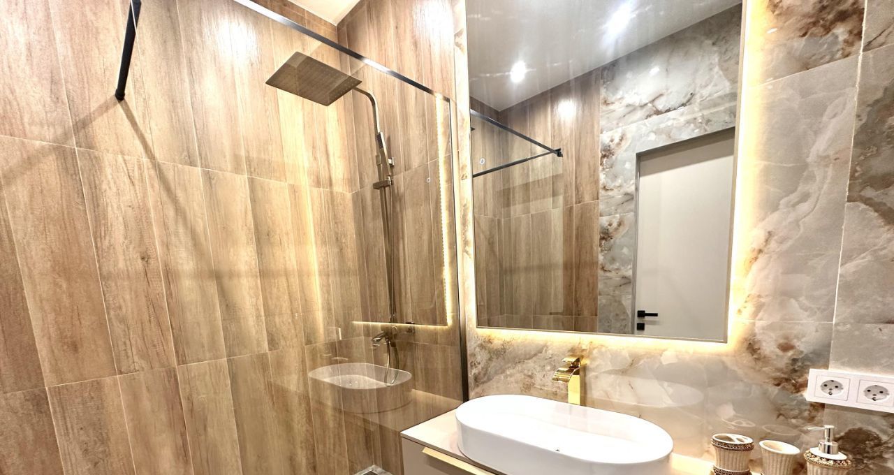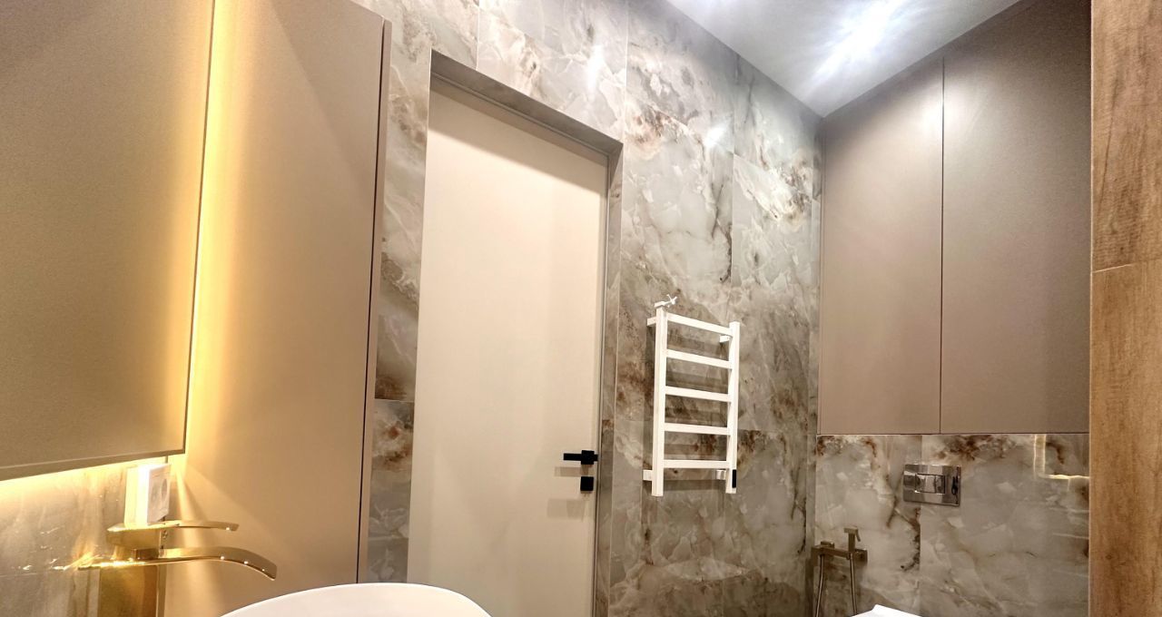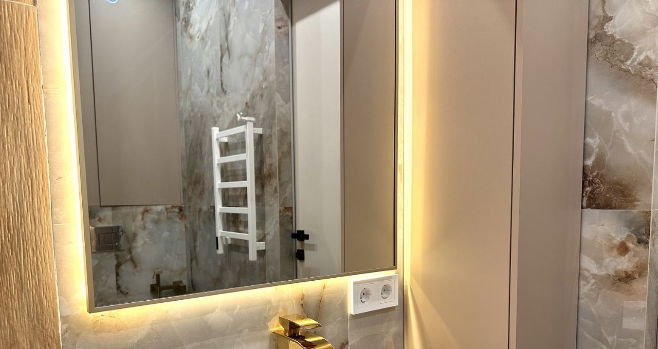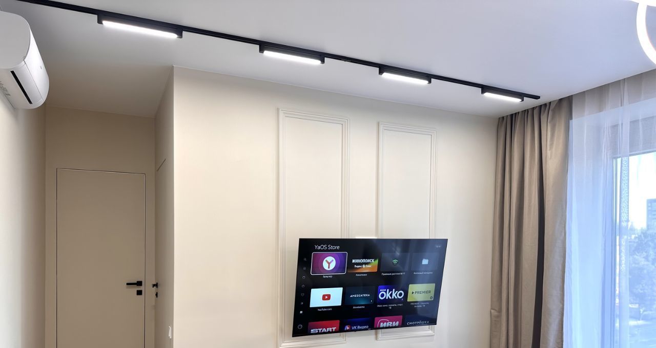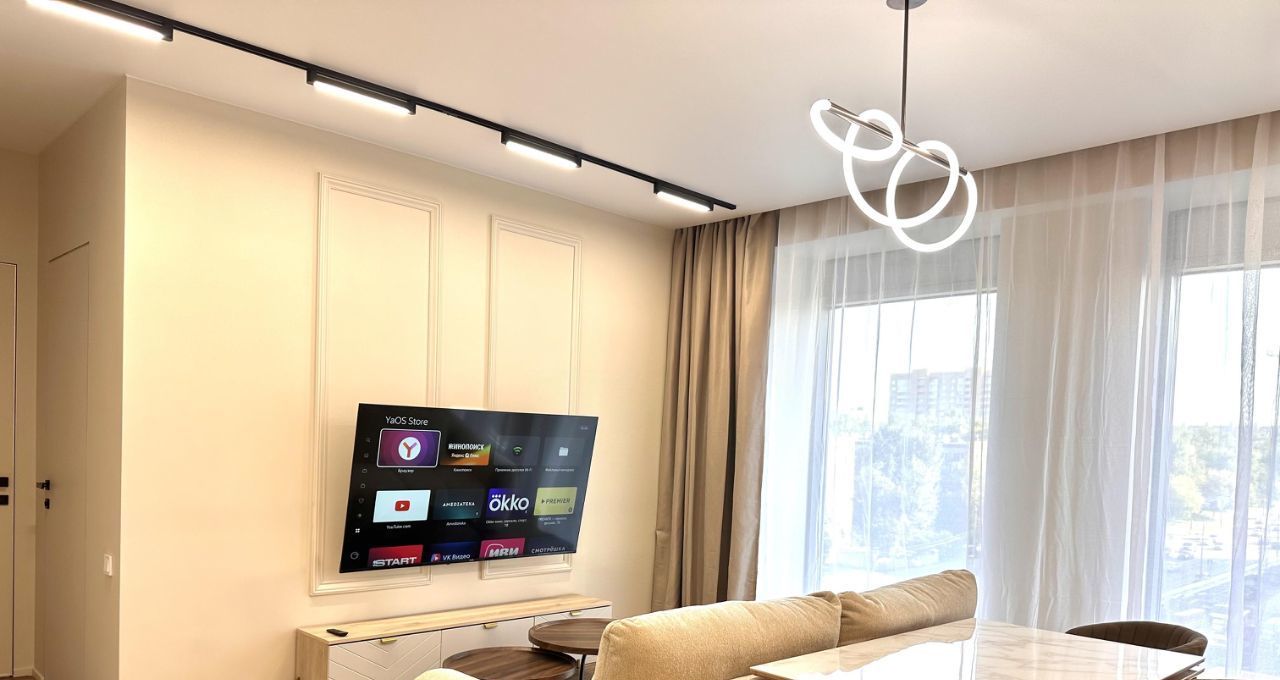 Трековое освещение с регулировкой направления света, люстры и зеркала с выбором режима освещения. Мастер-выключатель. Крупноформатные настенные слэбы. Мягкая мебель высокой категории ткани, диван со спальным местом.