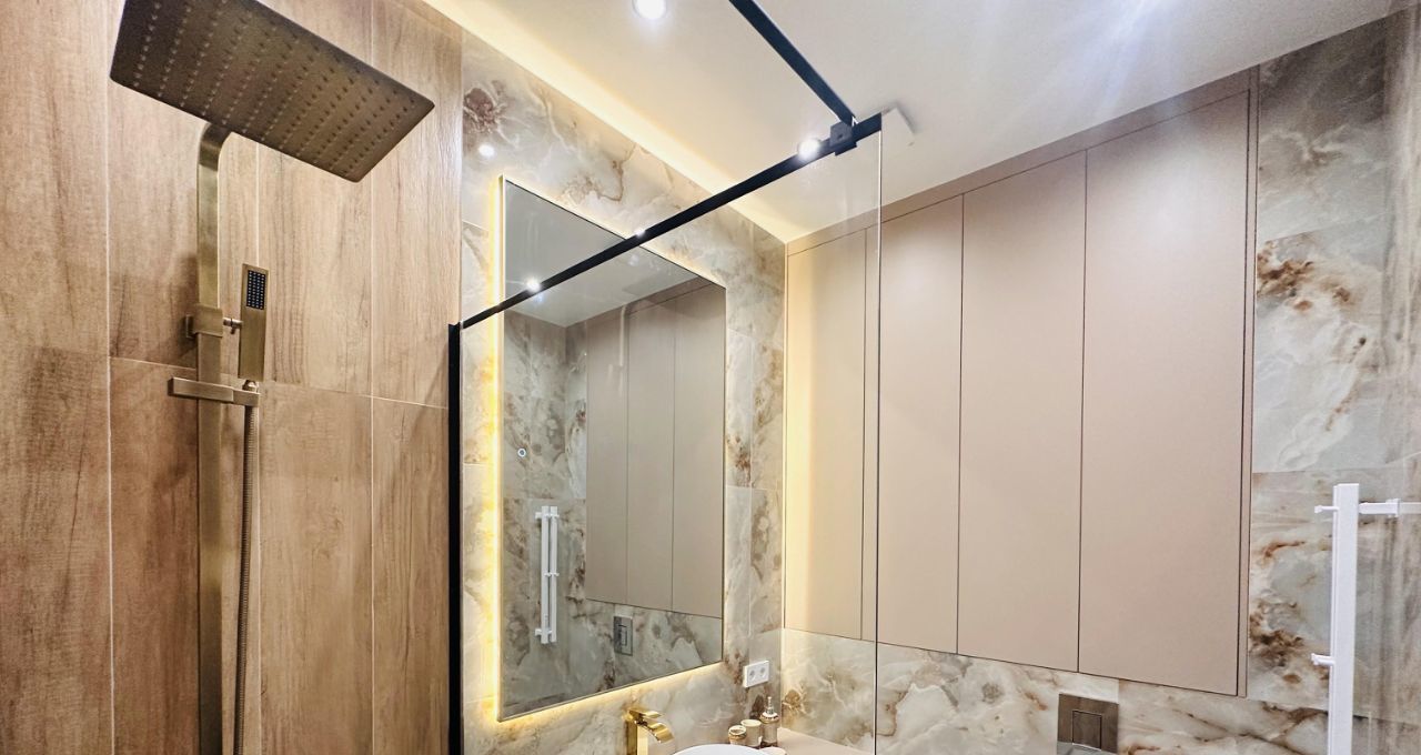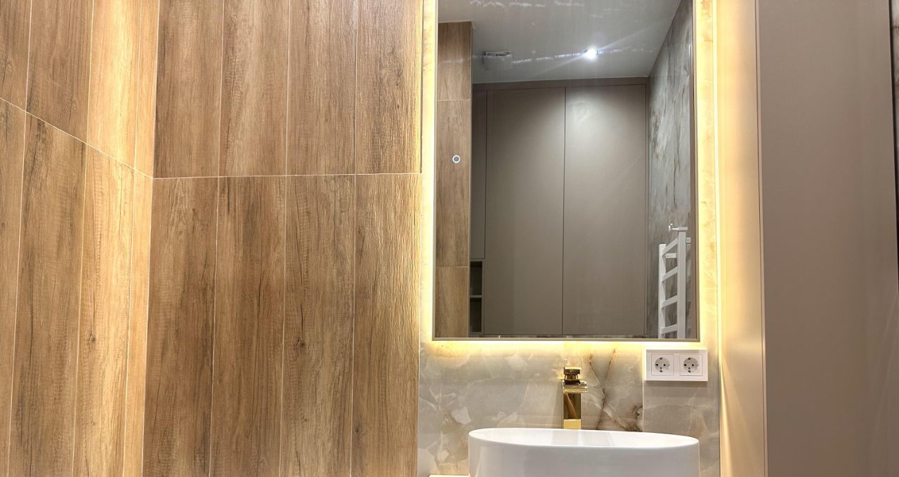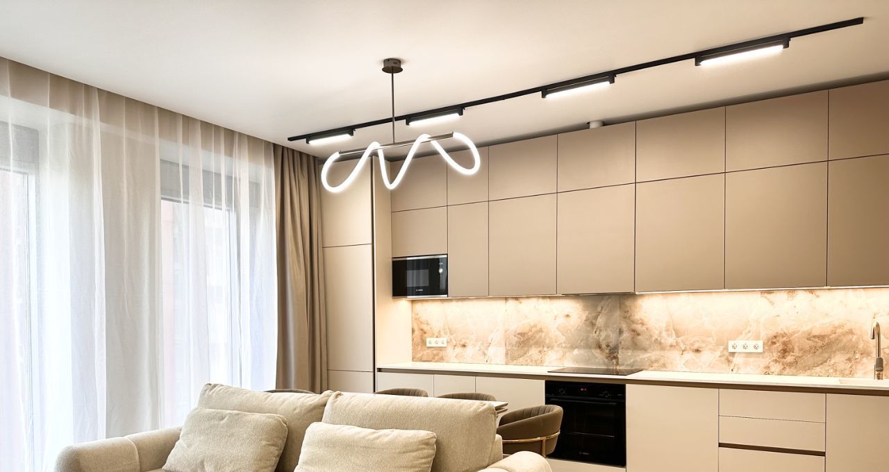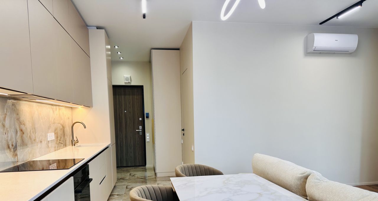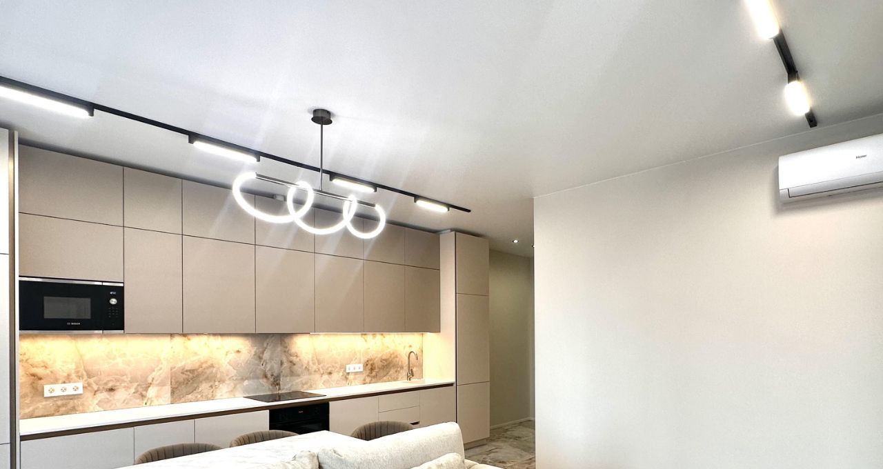 Трековое освещение с регулировкой направления света, люстры и зеркала с выбором режима освещения. Мастер-выключатель. Крупноформатные настенные слэбы. Мягкая мебель высокой категории ткани, диван со спальным местом.