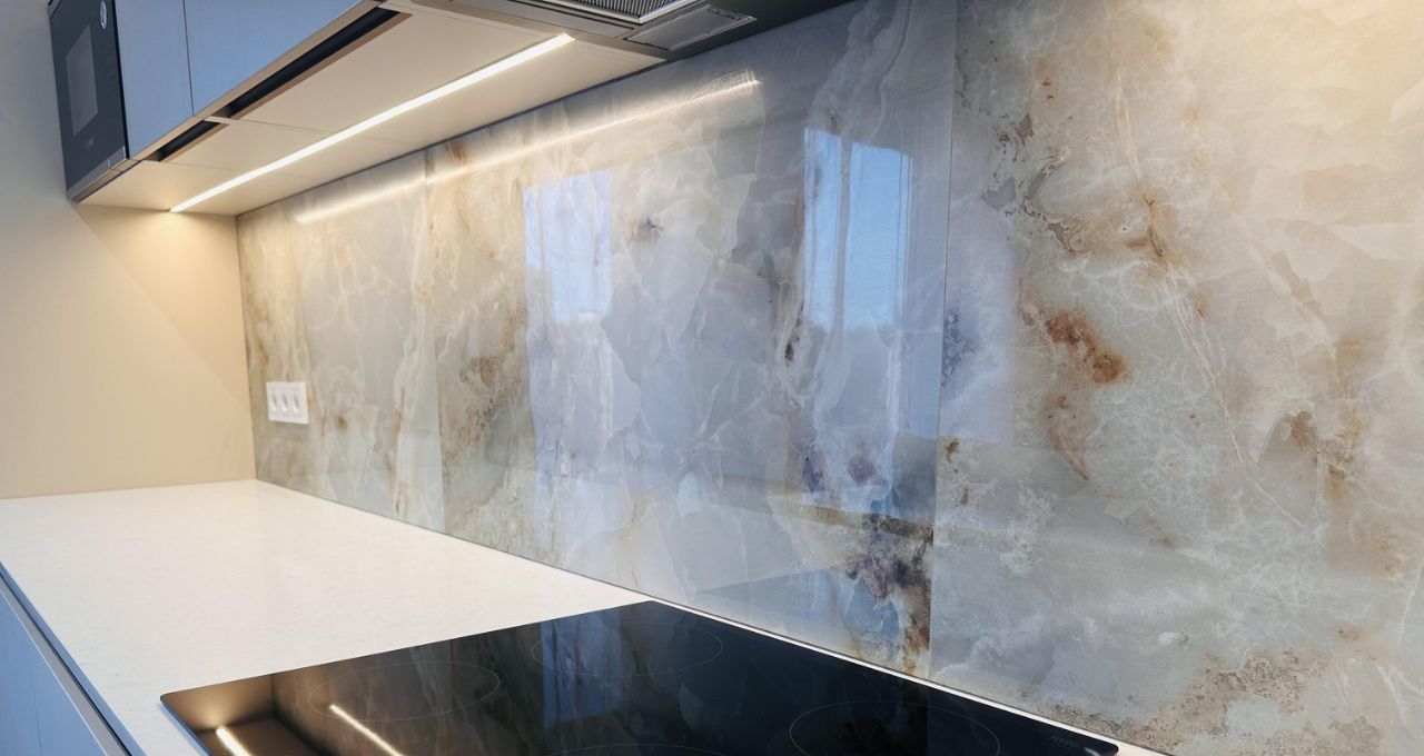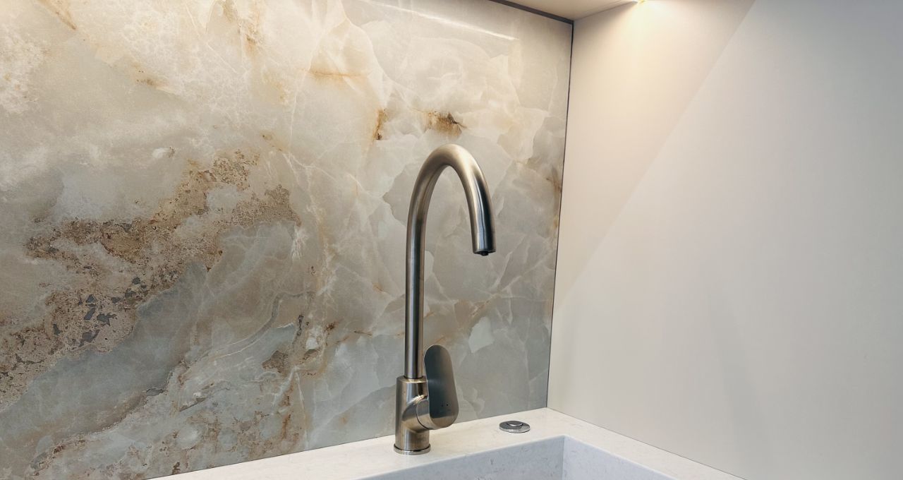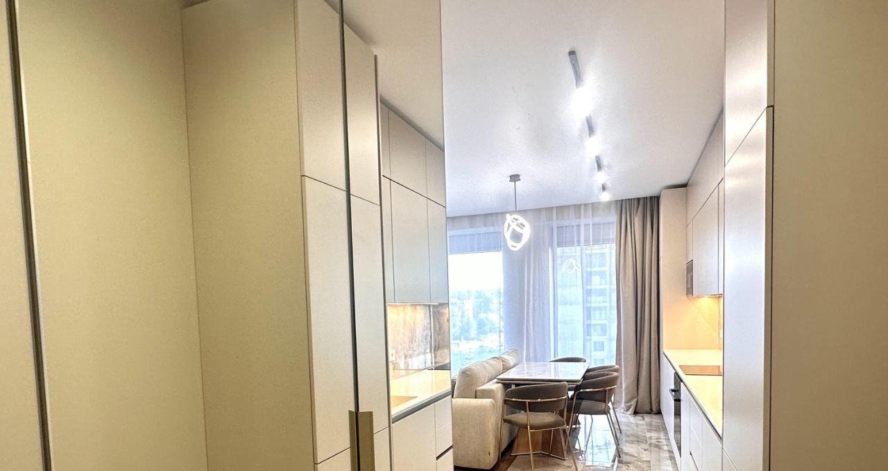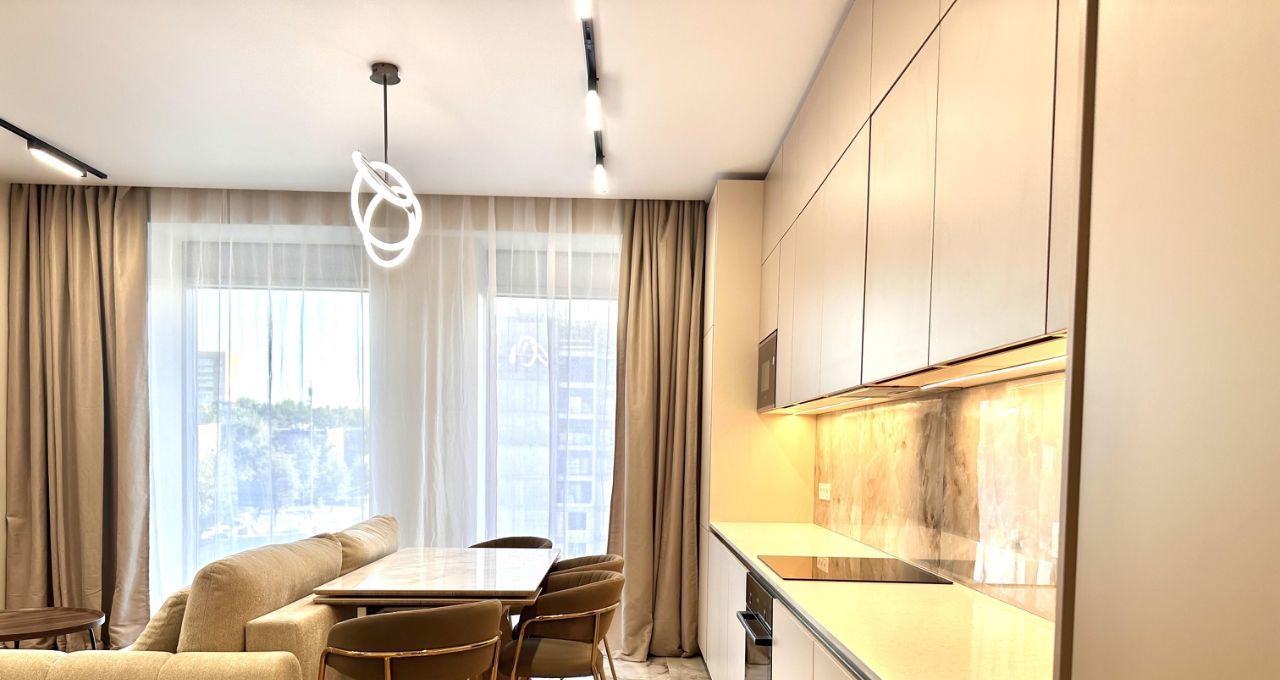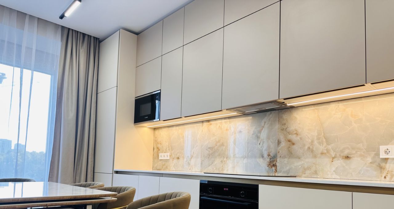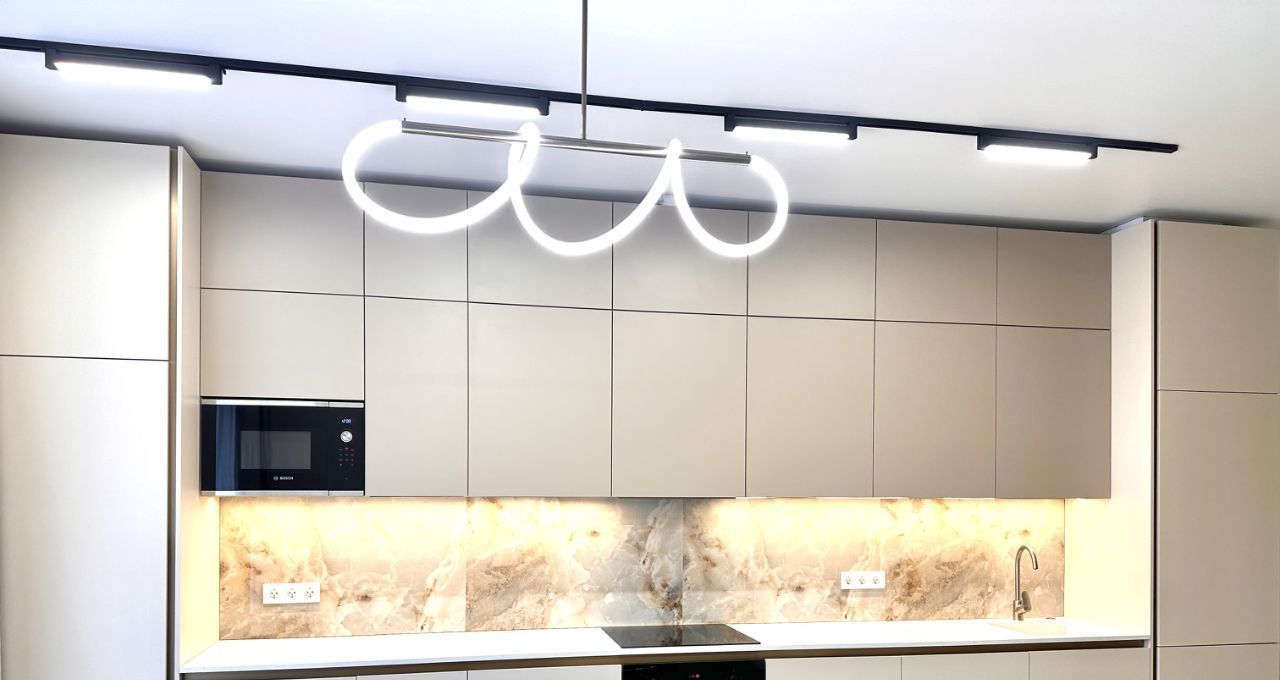 Большая премиум кухня, почти 6 метров, со встроенной техникой Bosch (в т.ч. посудомойка, холодильник, СВЧ, духовой шкаф, вытяжка), столешницей из камня с интегрированной раковиной из камня (кварц). Кухонная подсветка с датчиком жеста.