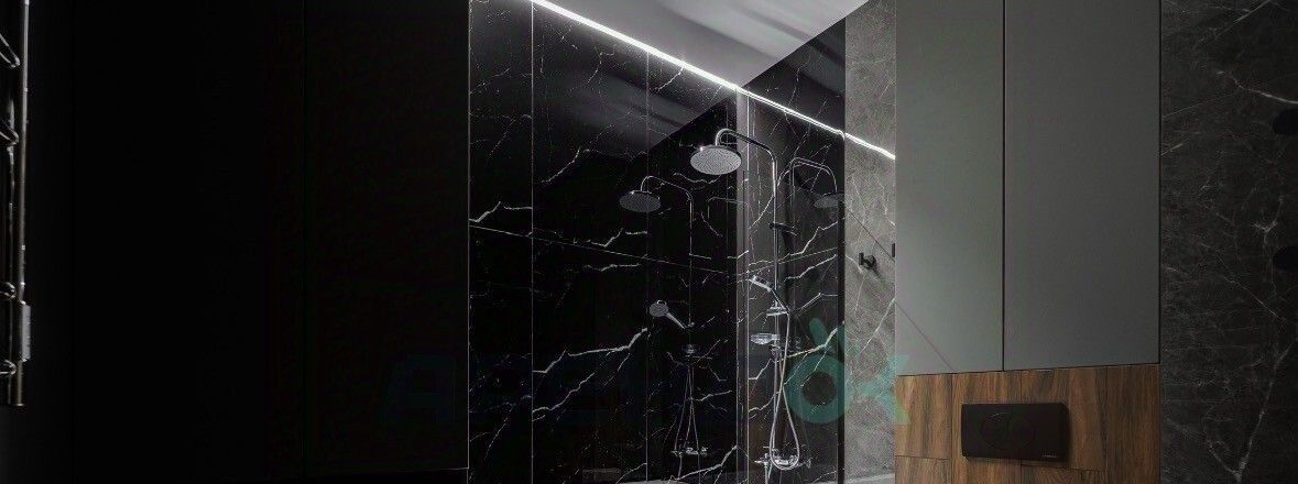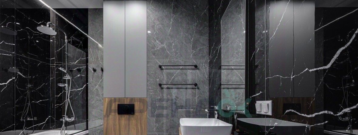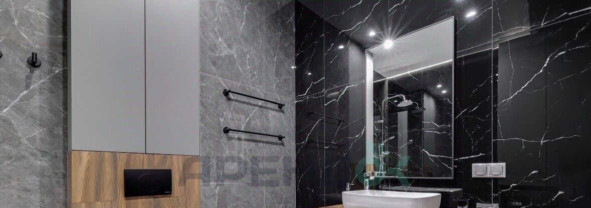 Сочетание глубокого темного камня и фактуры дерева. Стильная сантехника, большая зона зеркала и много места для хранения косметики.