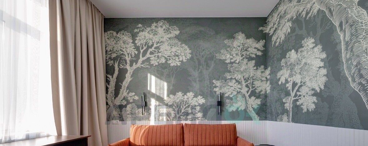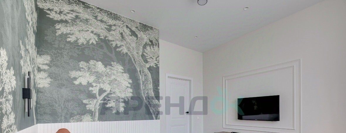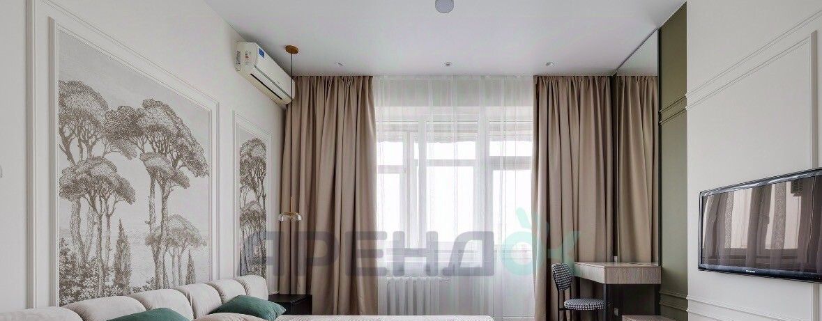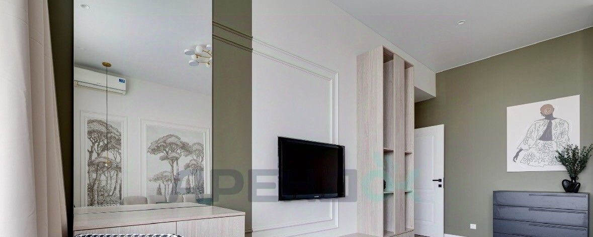 Просторная комната в спокойных природных тонах. Изюминка декоративные панно с туманным лесом и мягкое изголовье кровати. Здесь установлена большая система хранения, которая не загромождает пространство, и продуманы разные сценарии освещения.
