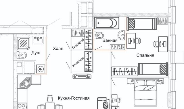 Кухня-гостиная (28 кв.м.), Две спальные (17 кв.м., 15 кв.м.), Ванная комната с санузлом (5 кв.м.), Душевая комната с санузлом (4 кв.м.), Прихожая ( 5.2 кв.м.), Гардеробная (2.6 кв.м), Кладовая (2.3 кв. м.).