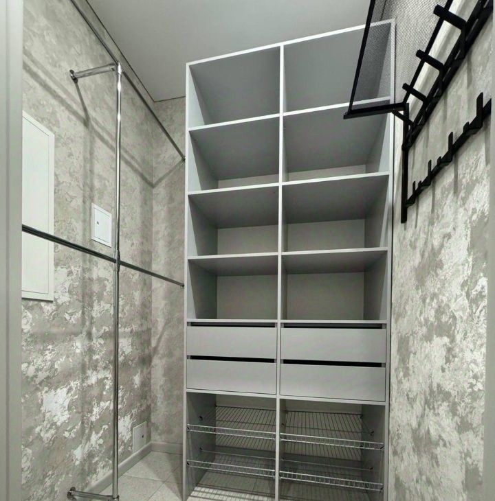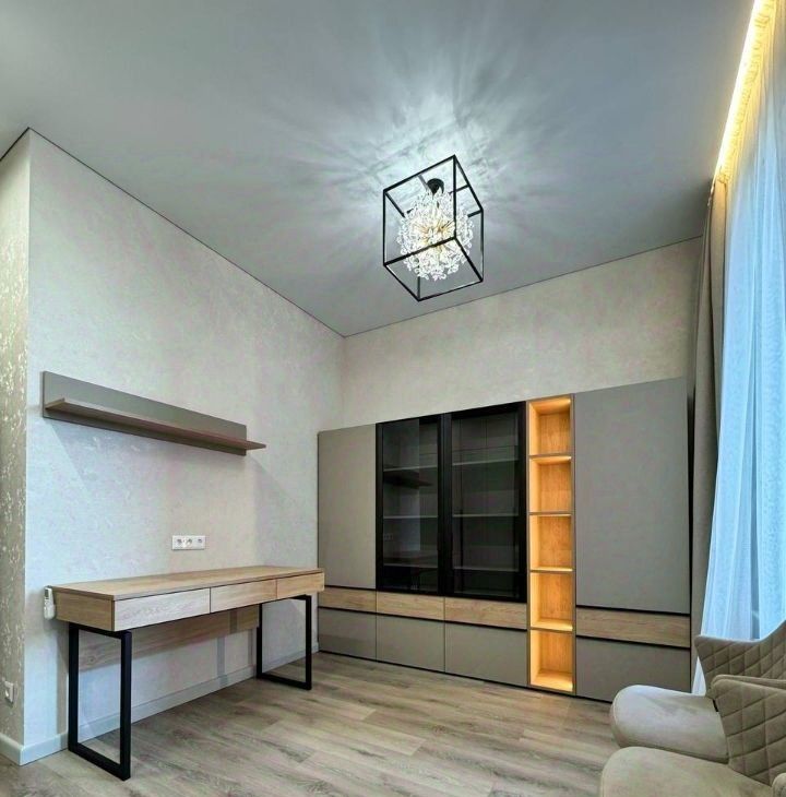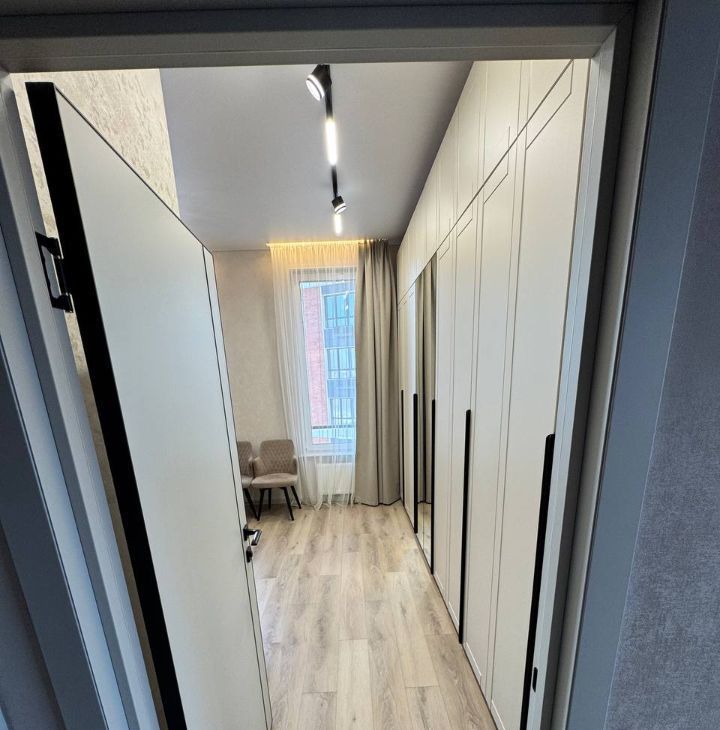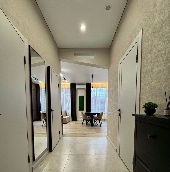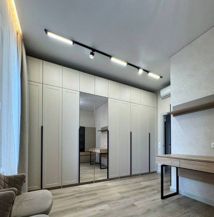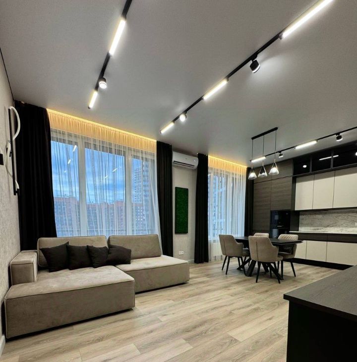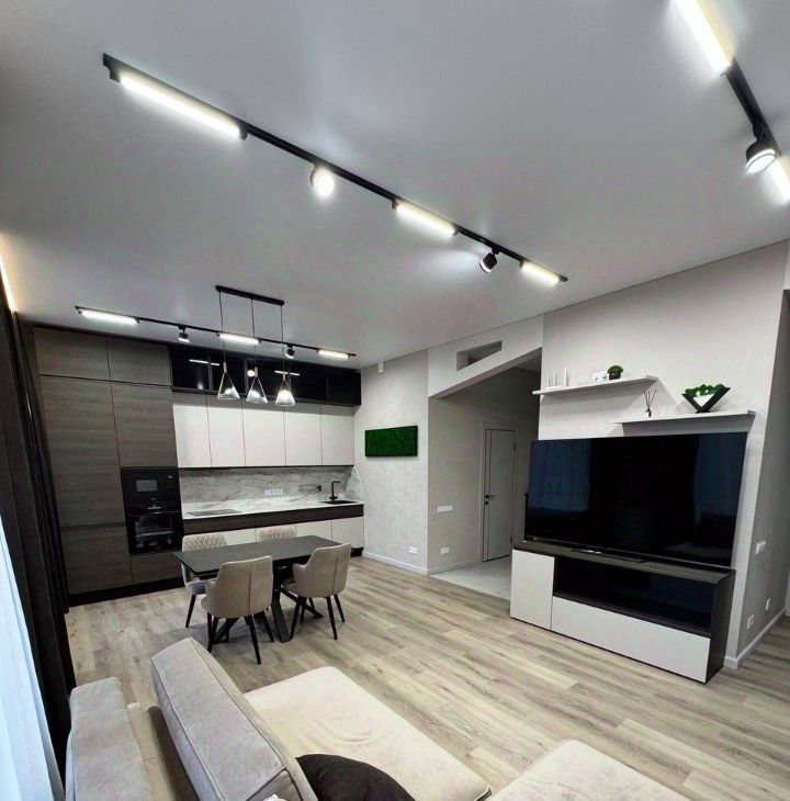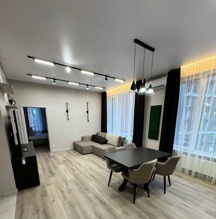 Продуманная планировка: кухнягостиная около 28 м², две изолированные комнаты, два санузла (ванна и душ), гардеробная и кладовая. Квартира полностью меблирована, кухня со встроенной техникой (духовой шкаф, варочная панель, посудомоечная машина, холодильник), в одной комнате — спальня с двуспальной кроватью, в другой — кабинет/гардеробная; установлены кондиционеры и много систем хранения. В одном санузле ванна и стиральная машина, во втором — душевая кабина.