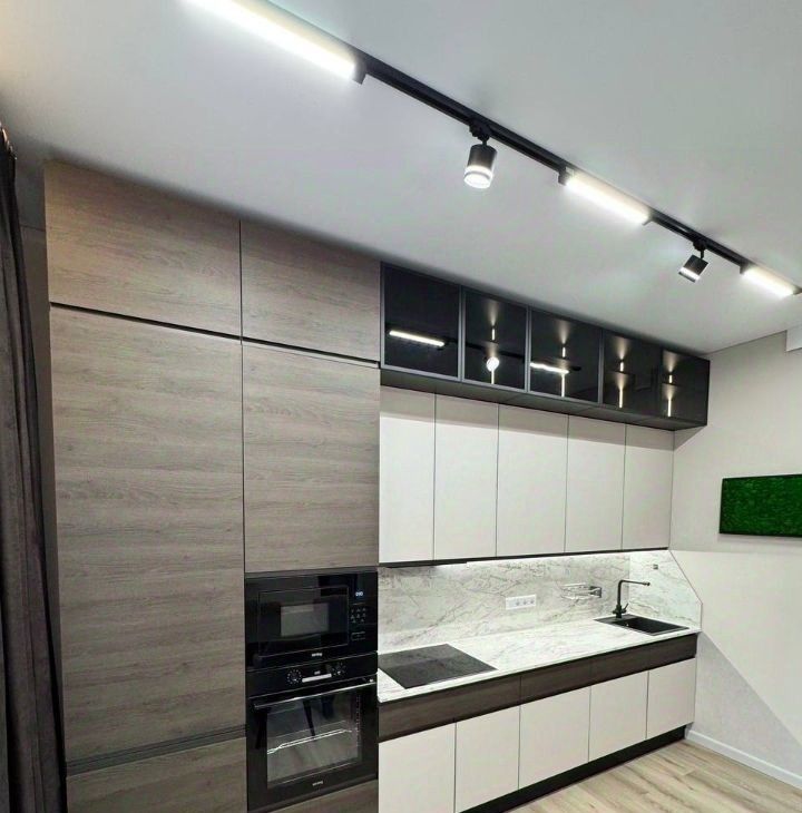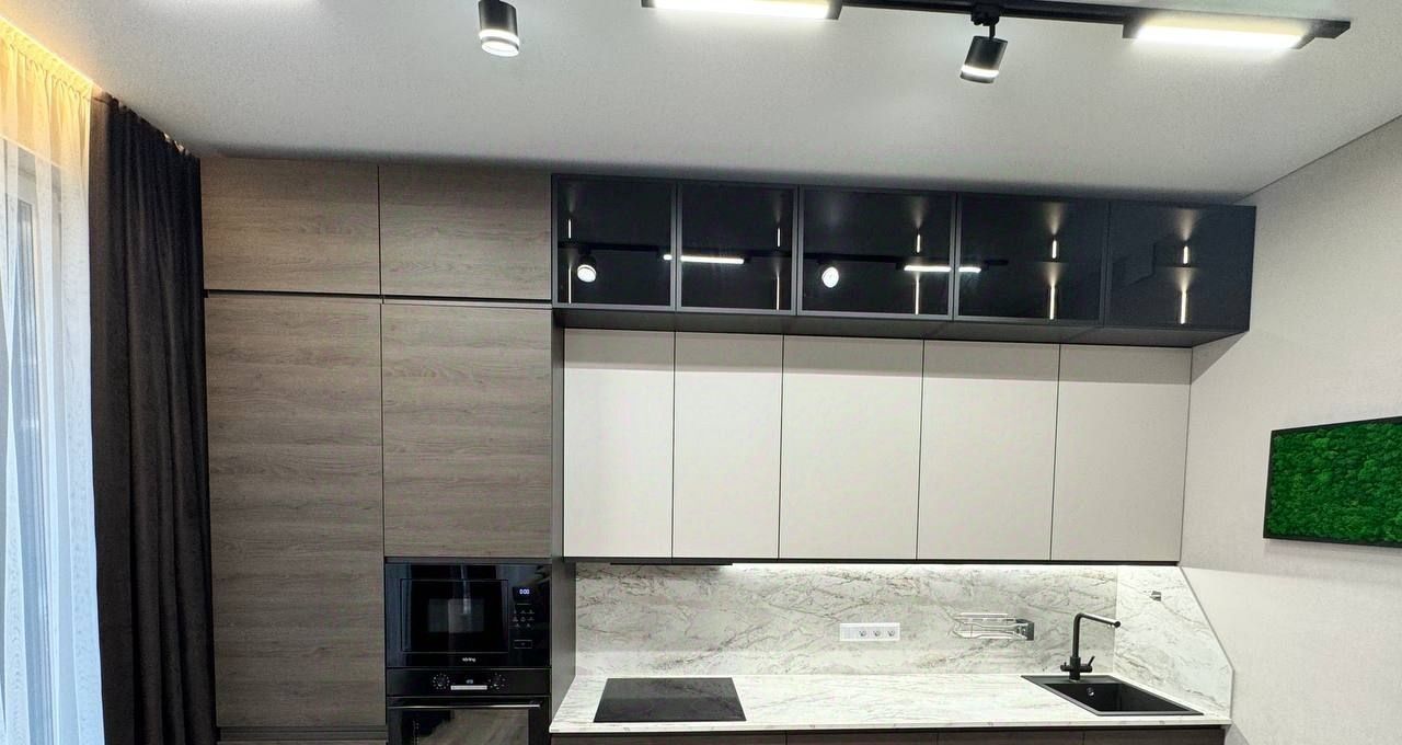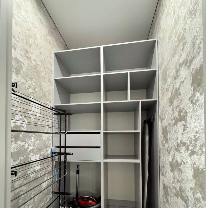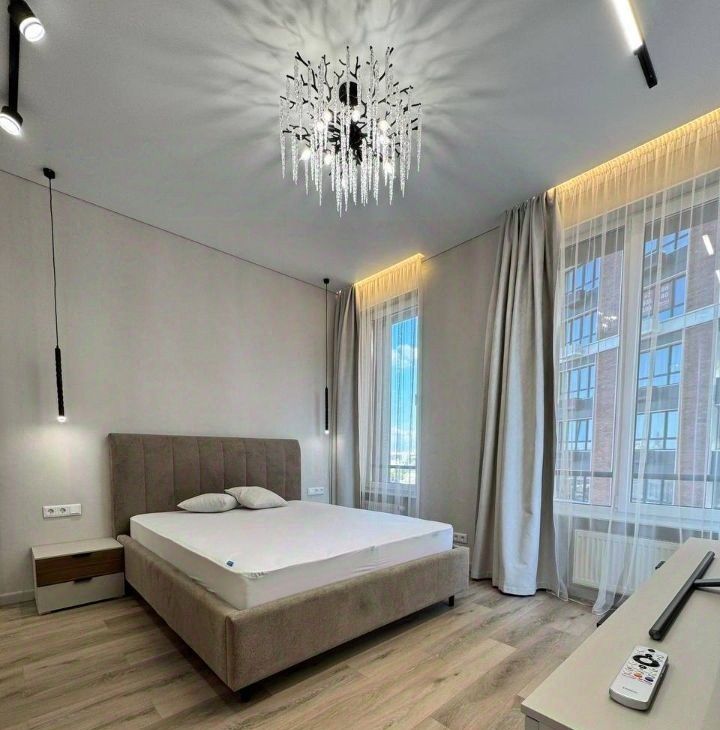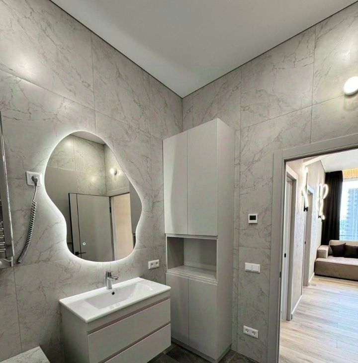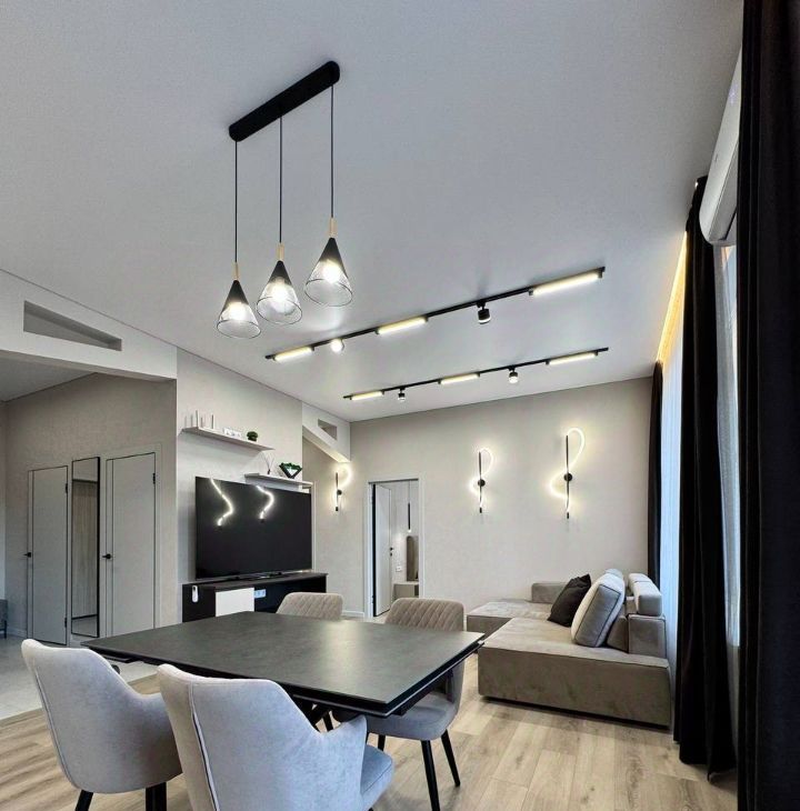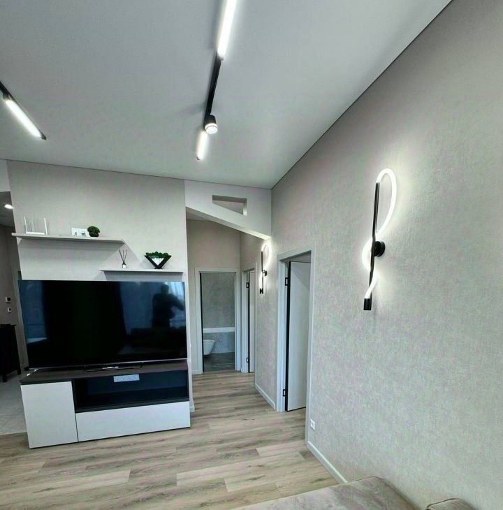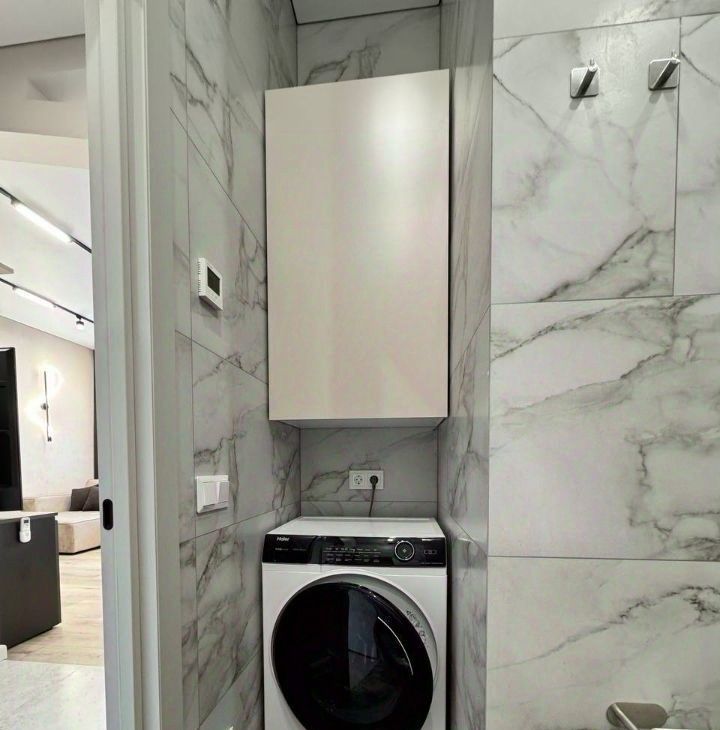 Продуманная планировка: кухнягостиная около 28 м², две изолированные комнаты, два санузла (ванна и душ), гардеробная и кладовая. Квартира полностью меблирована, кухня со встроенной техникой (духовой шкаф, варочная панель, посудомоечная машина, холодильник), в одной комнате — спальня с двуспальной кроватью, в другой — кабинет/гардеробная; установлены кондиционеры и много систем хранения. В одном санузле ванна и стиральная машина, во втором — душевая кабина.