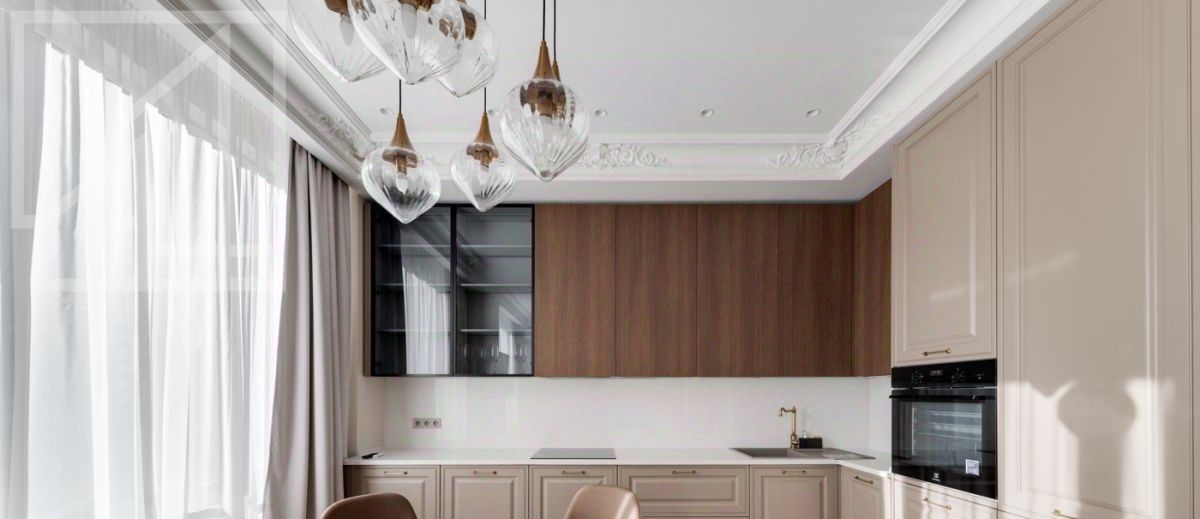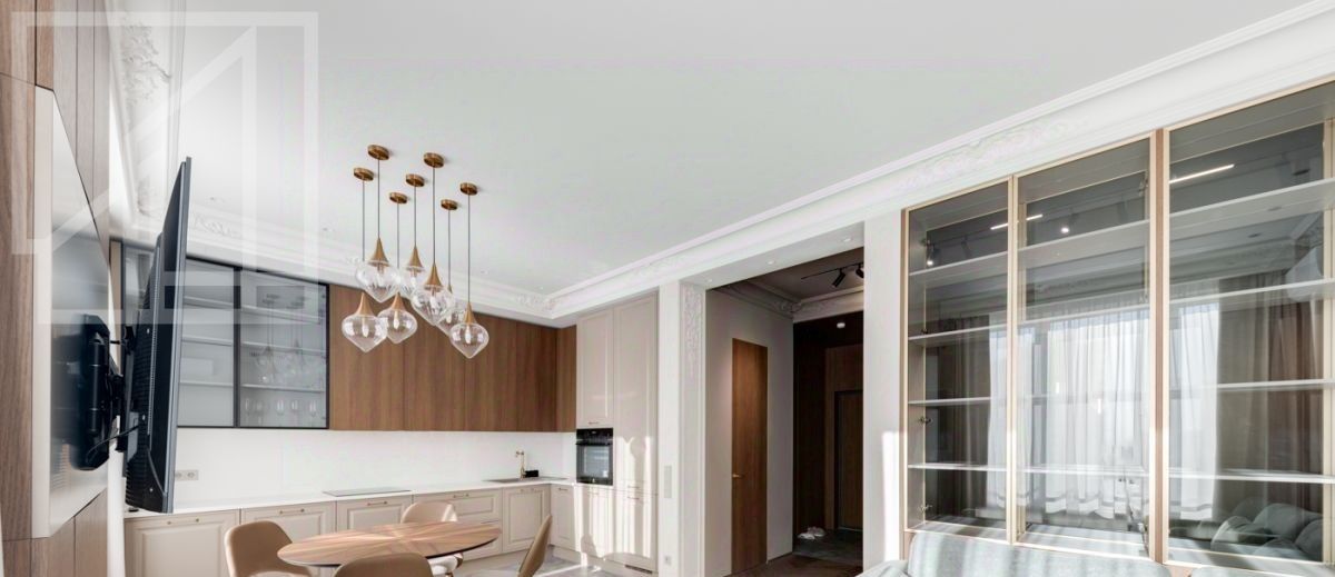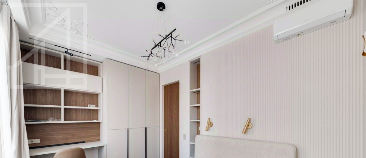Планировка: просторная кухня-гостиная, две спальни, два совмещенных санузла (один с душевой кабиной, второй с ванной). Есть прачечная. Выполнена премиальная дизайнерская отделка в современном стиле (неоклассика).Квартира полностью меблирована и оснащена бытовой техникой. Окна выходят во внутренний закрытый двор-парк.