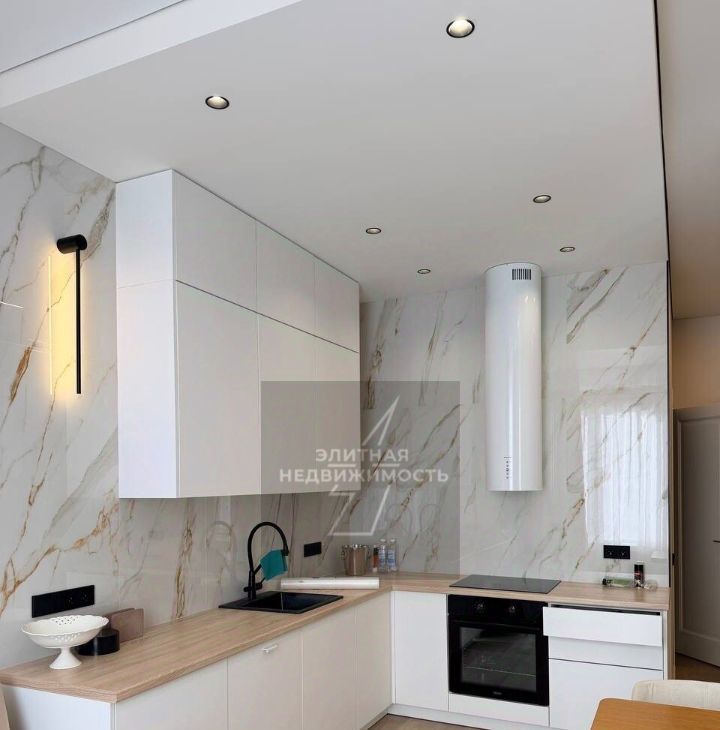 Светлая кухня-гостиная, на кухне, встроенная техника, в гостиной большой теливизор и удобный диван.