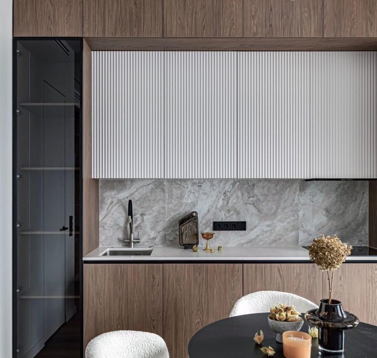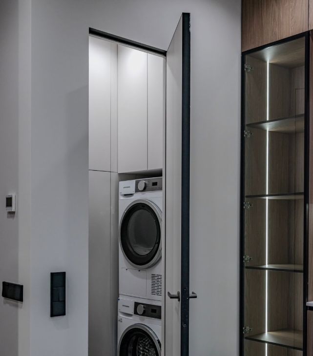 Вся встроенная бытовая техника установлена (плита, духовой шкаф, винный шкаф, холодильник, посудомоечная машина, сушильная и стиральная машинки, телевизор).
