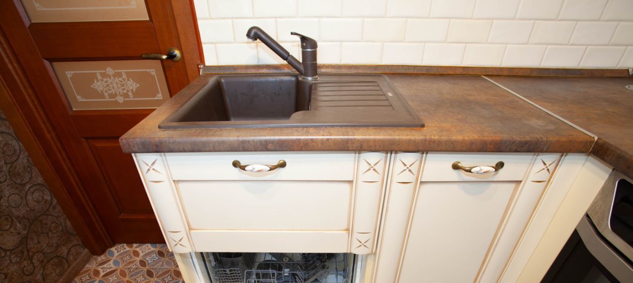 В кухне: кухонный гарнитур, встроенная посудомоечная машина, варочная панель, духовой шкаф, холодильник, микроволновая печь, стол со стульями.