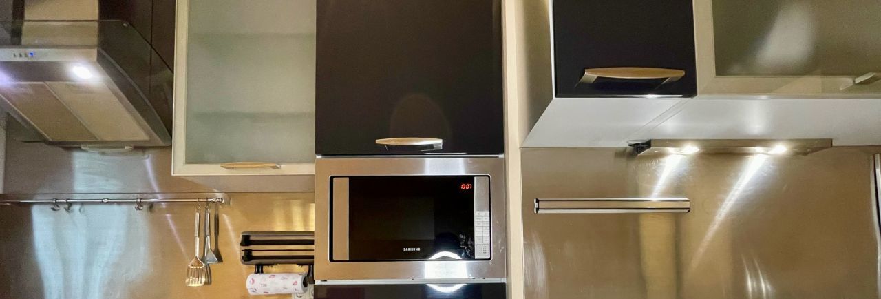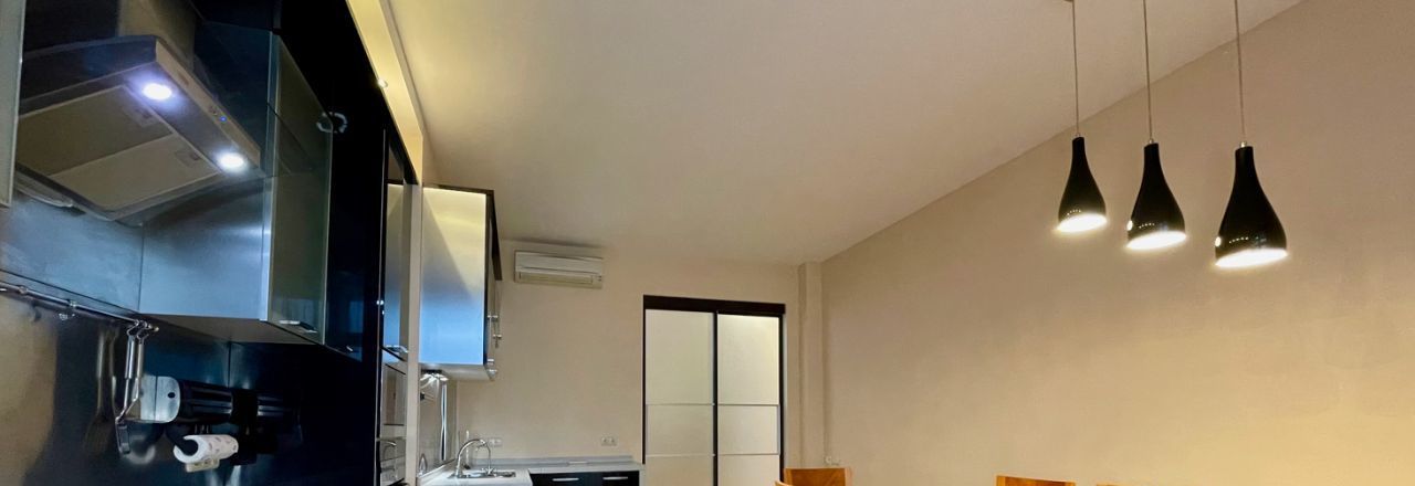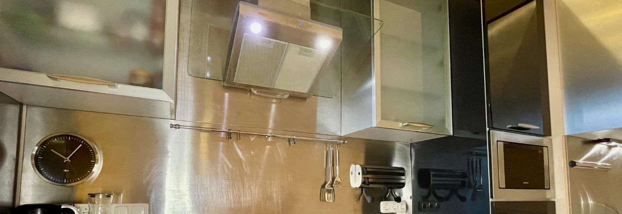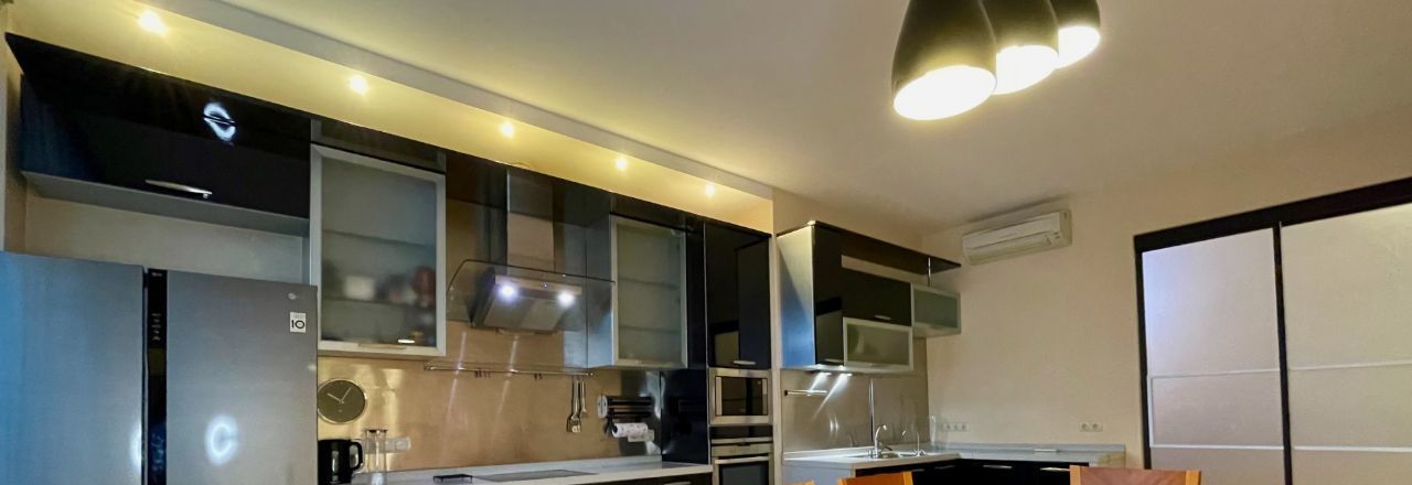 На кухне вся необходимая техника: духовка, двухдверный холодильник, посудомоечная машина, кондиционеры в квартире, телевизор.