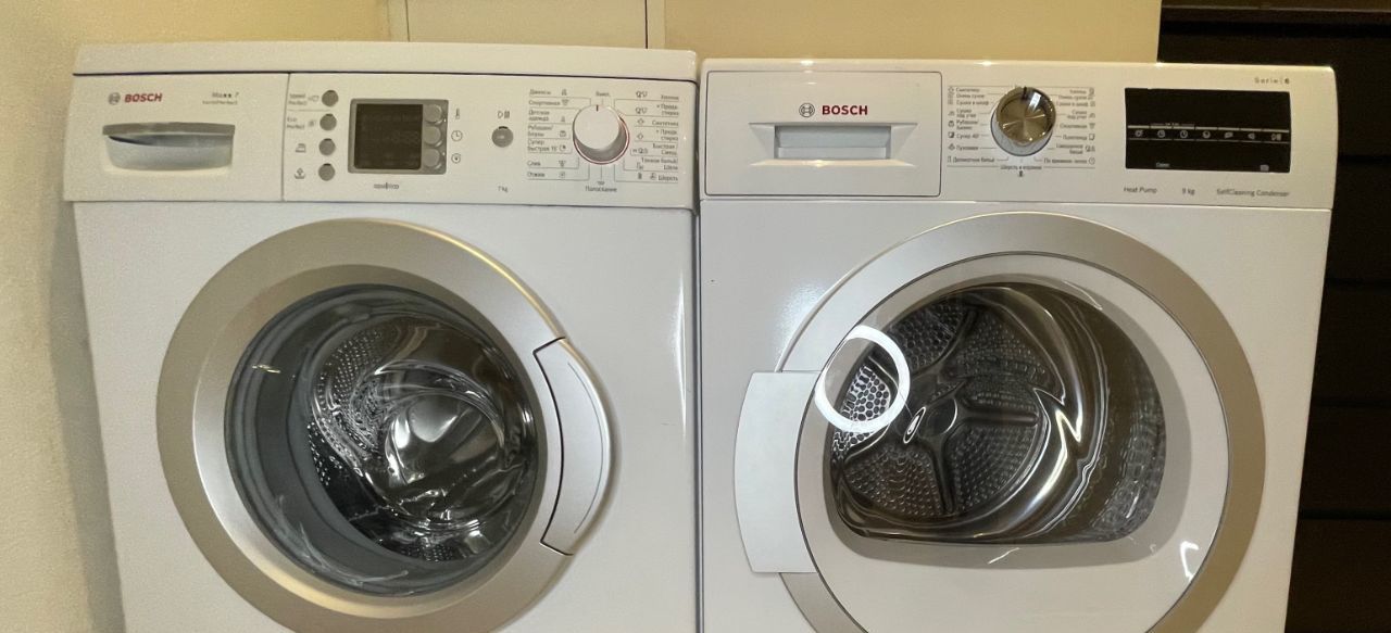 Большая прачечная комната (6 кв. метров) со стиральной и сушильной машинами Bosch, установлен водонагреватель, предусмотрено много мест для хранения.