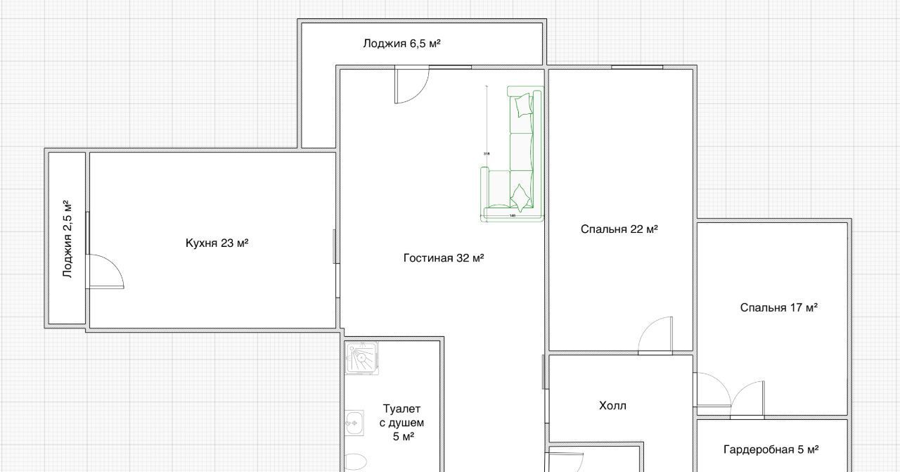 гостиная - 32 кв. метра + лоджия 6,5 кв. метров;