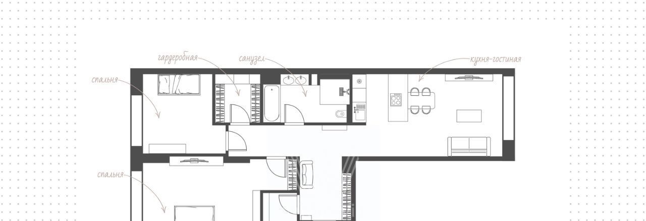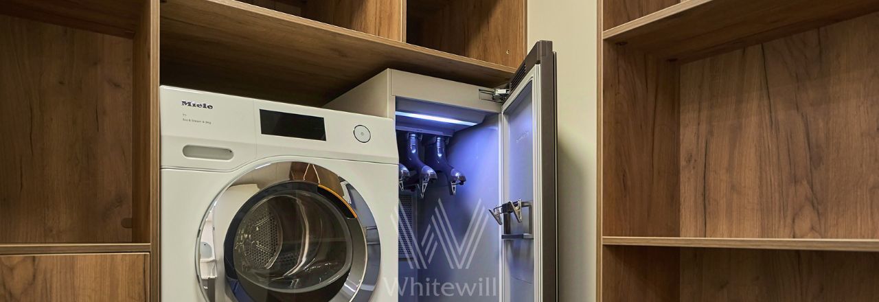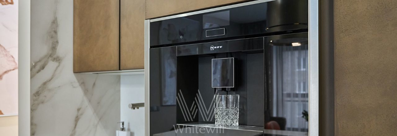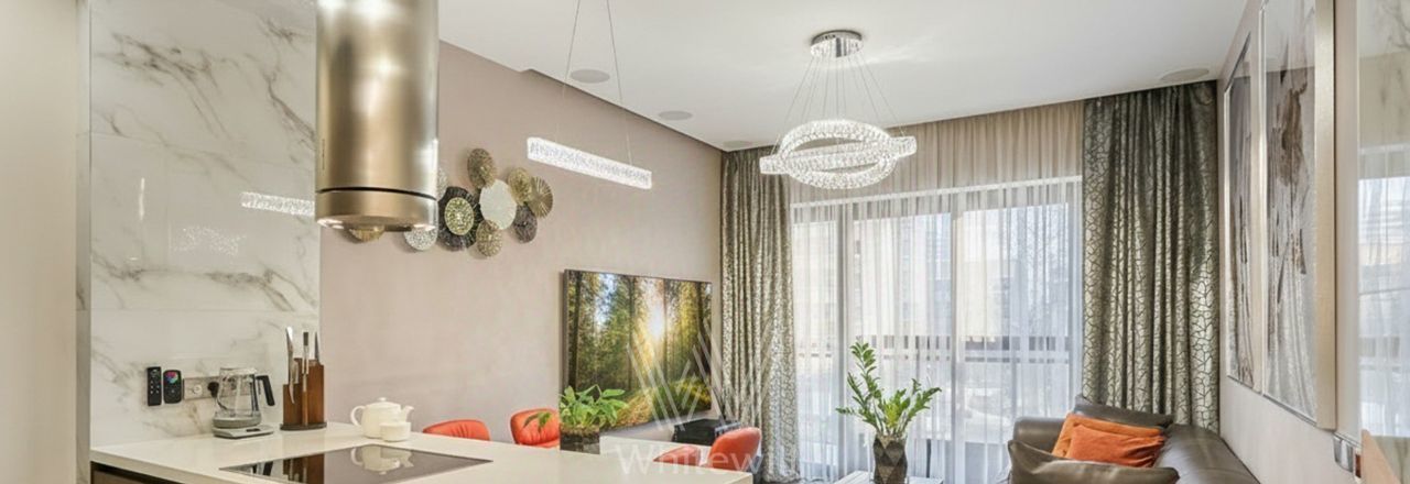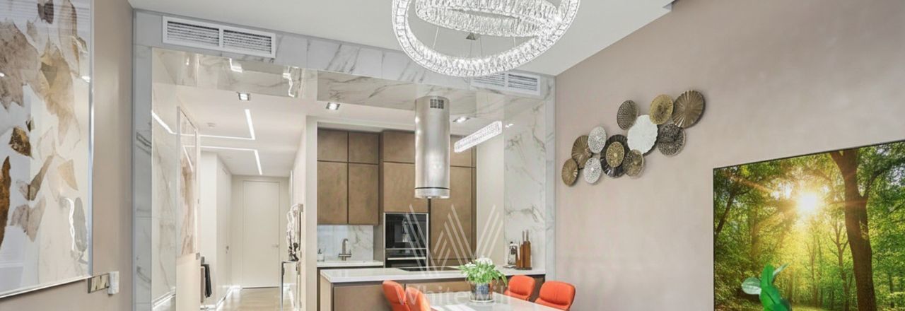 Спланирована кухня-гостиная с островом и обеденной зоной, мастер-спальня с гардеробной, детская спальня или кабинет, ванная комната, гардеробная, постирочная, прихожая с системами хранения. Квартира полностью меблирована, немецкая кухня Leicht оборудована техникой Neff, включая винный шкаф и кофемашину. Постирочная оснащена стиральной и сушильной машинами Miele, паровым шкафом Samsung. Установлена входная дверь с доступом по отпечатку пальца, электронный звонок, видеонаблюдение и домофон BAS-IP. Предусмотрены 2 машино-места с зарядной станцией в подземном паркинге.