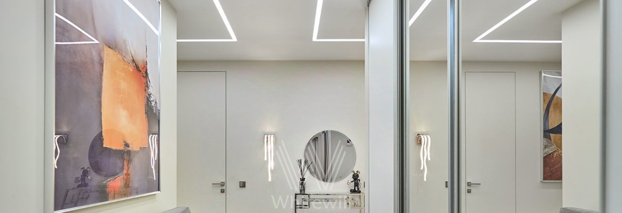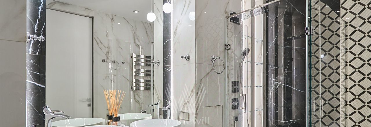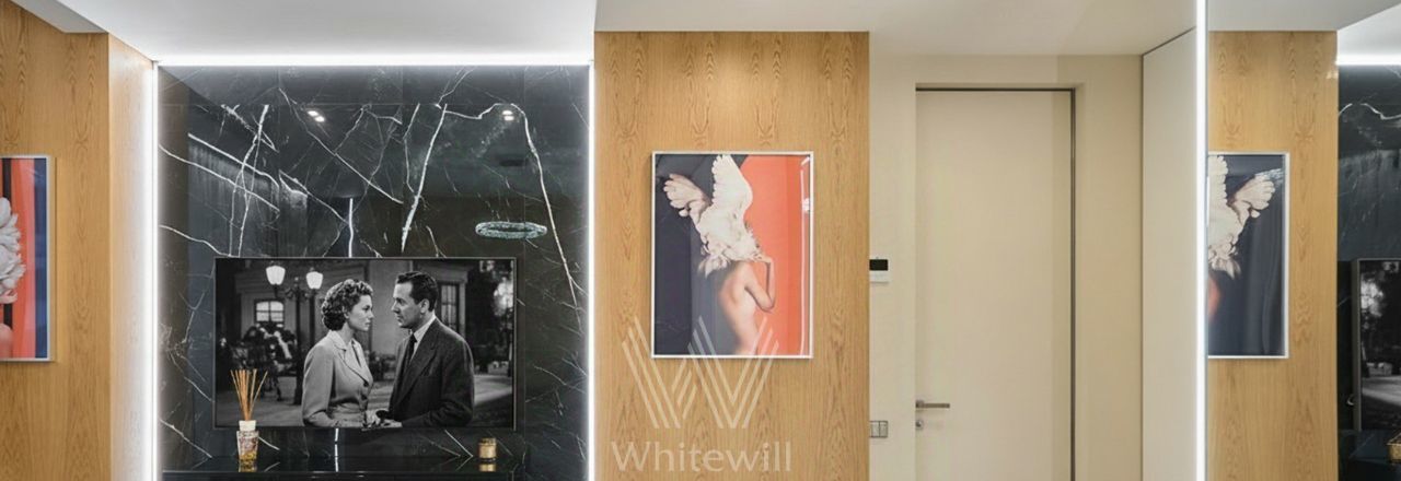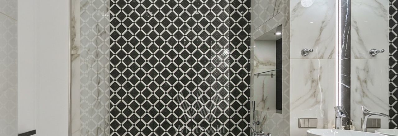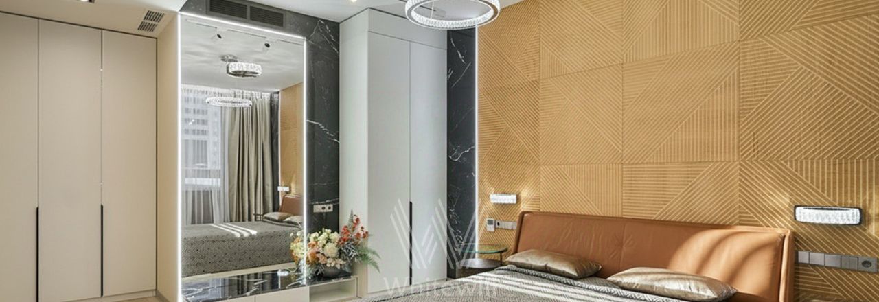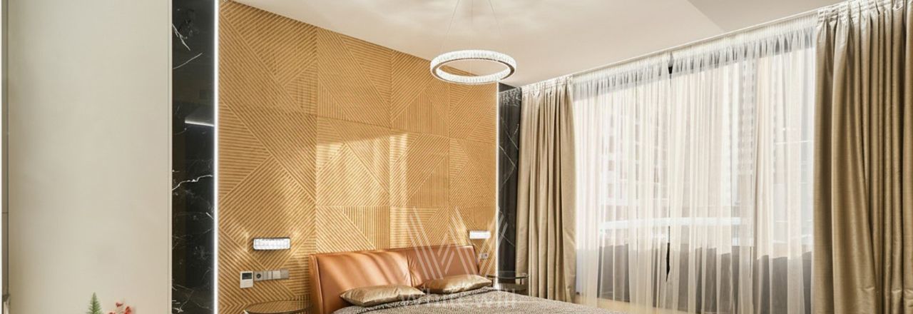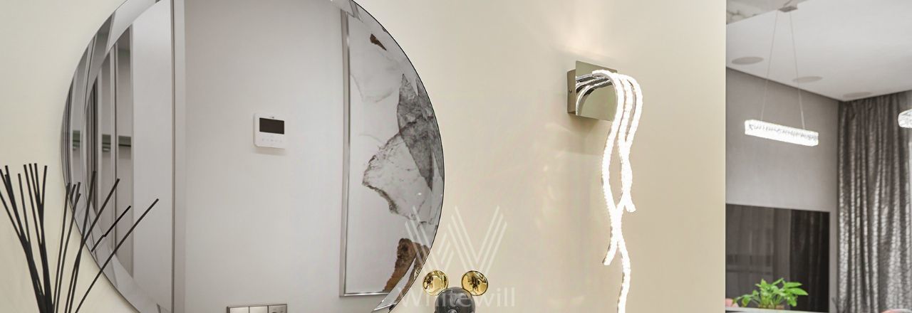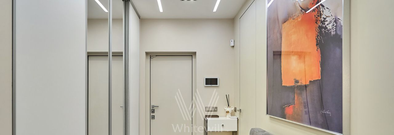Квартира с 2 спальнями общей площадью 87 м² в комплексе Headliner рядом с набережной Москвы-реки и деловым центром "Москва-Сити". Выполнен дизайнерский ремонт в современном стиле в светлых тонах. В оформлении использованы премиальные материалы — натуральный шпон, итальянский керамогранит, инженерная доска Fenix. Квартира укомплектована мебелью Baxter, BoConcept, Cattelan Italia, Minotti. Интерьер дополняют хрустальные LED-люстры и непальский ковёр ручной работы.
