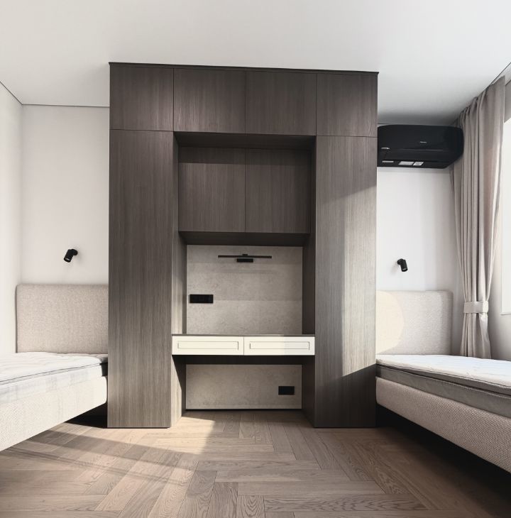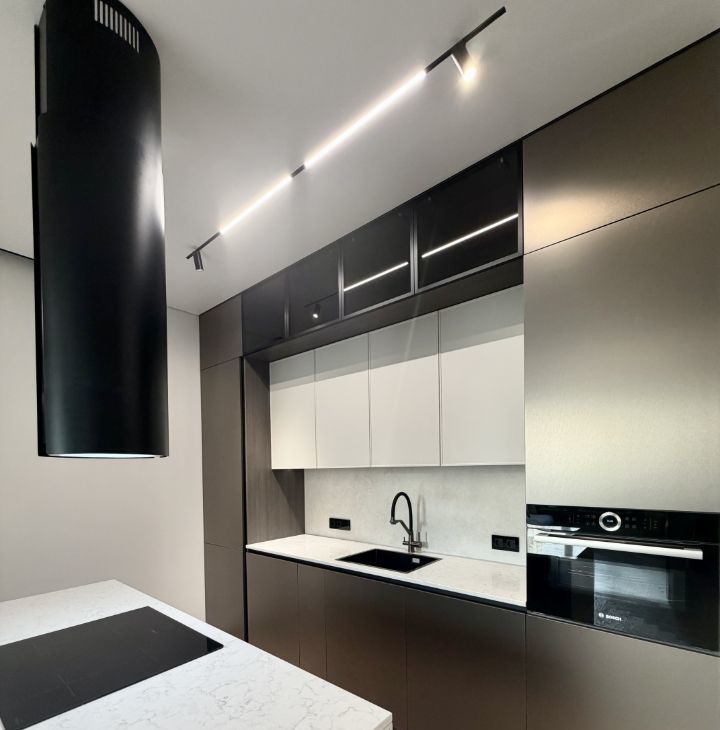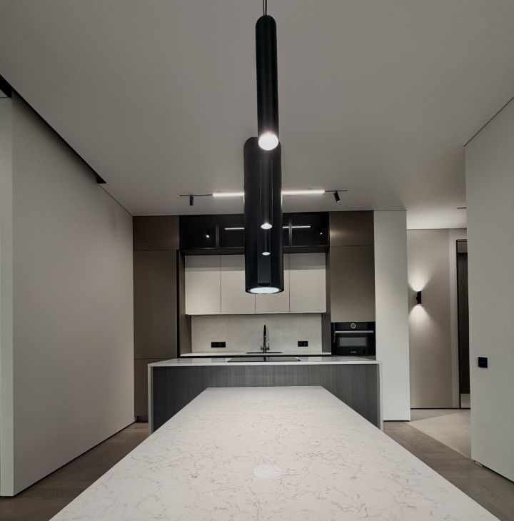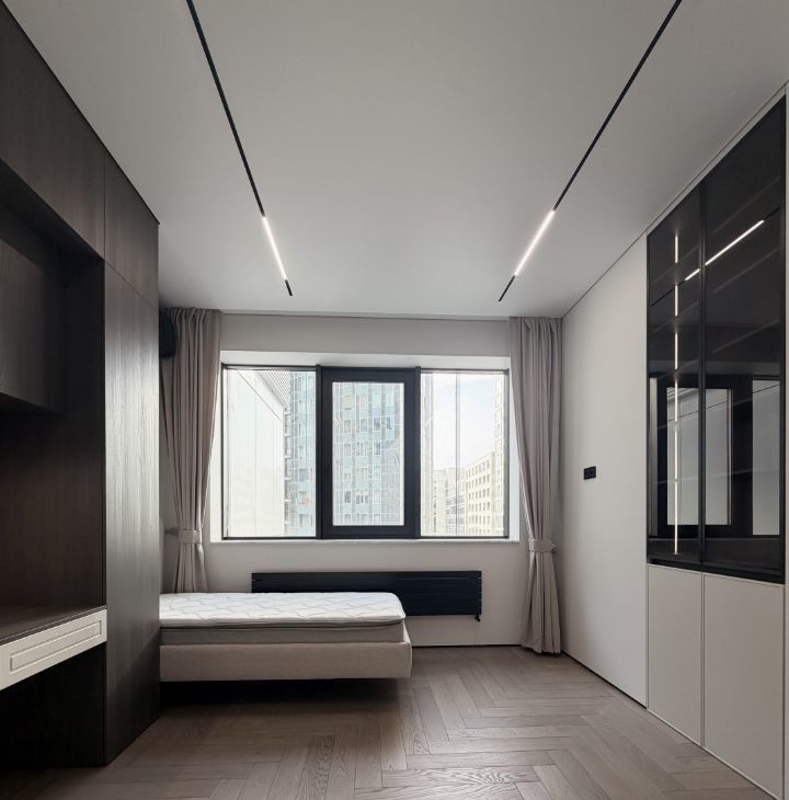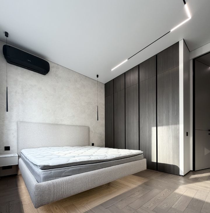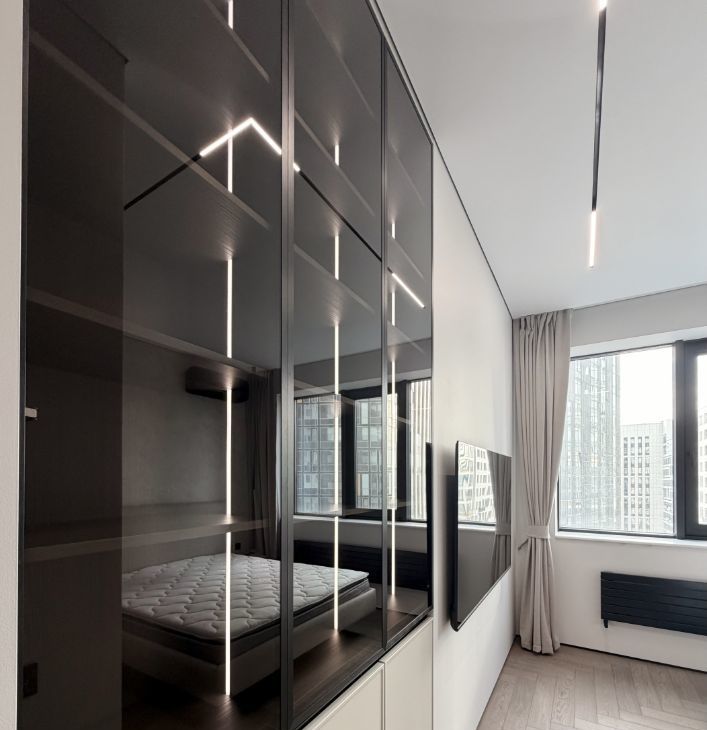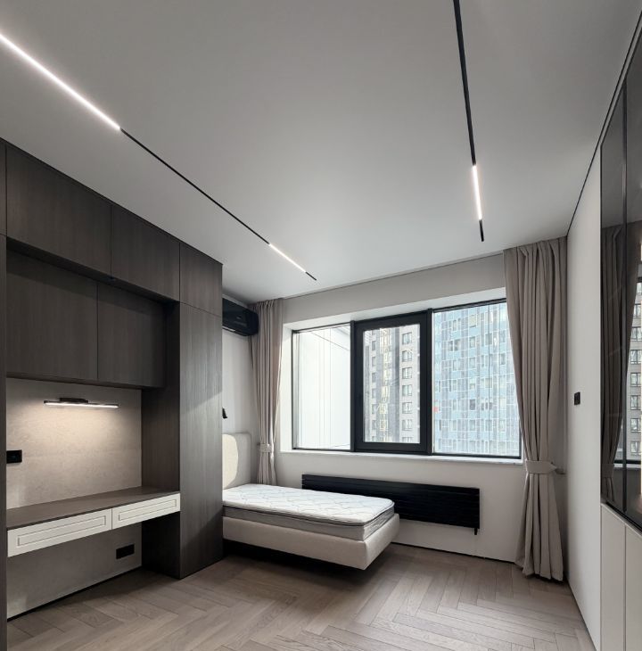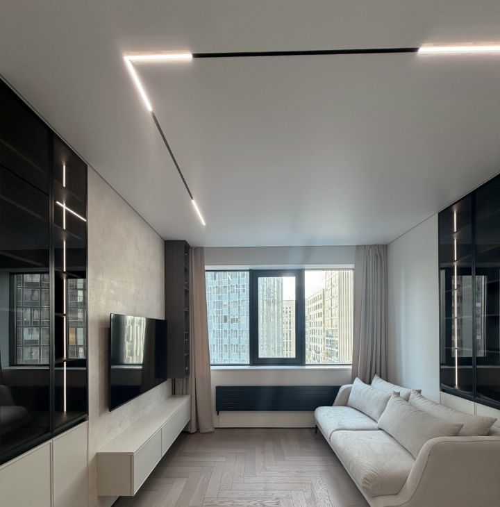 Теневой потолочный профиль Euro-Craab, создающий эффект парящего потолка с электрическими карнизами для штор. Встроенная магнитная трековая система освещения, дополненная аудиосистемой (по желанию дополняется светильниками и колонками). Сенсорные выключатели.