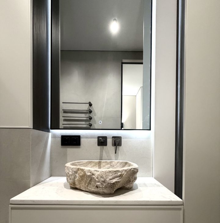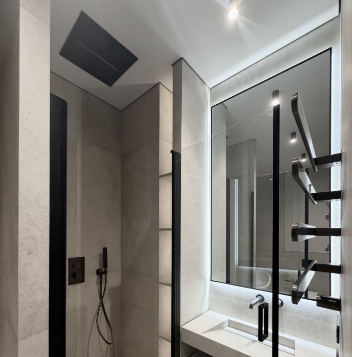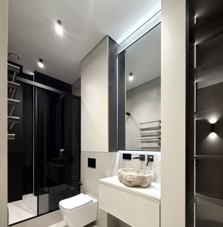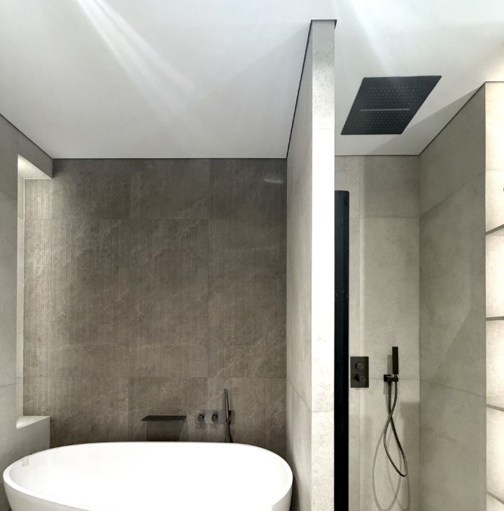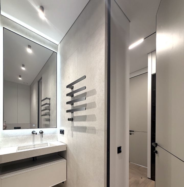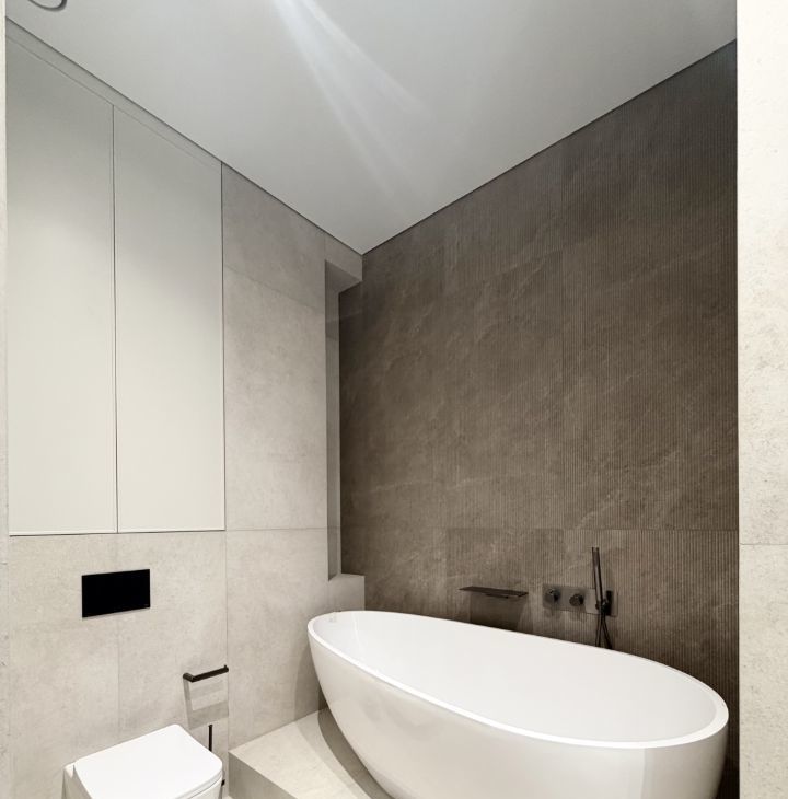 Встроенная сантехника скрытого монтажа, создающая лаконичный дизайн ванной комнаты (вся сантехника брендов: Omnires, Grohe, Villeroy & Boch). Инсталляция