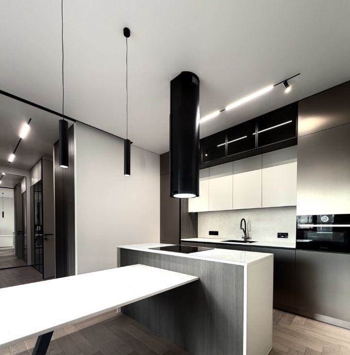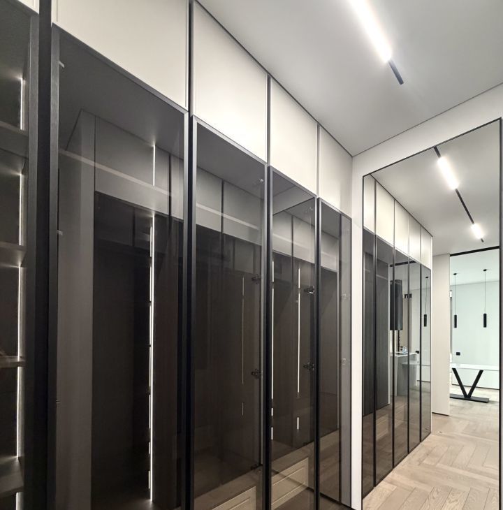 Вся мебель встроенная, изготовлена по индивидуальному проекту с вниманием к мелочам. Фурнитура Blum. Все фасады с покрытием двусторонней эмали. Очень много мест хранения (16 шкафов + различные тумбы).