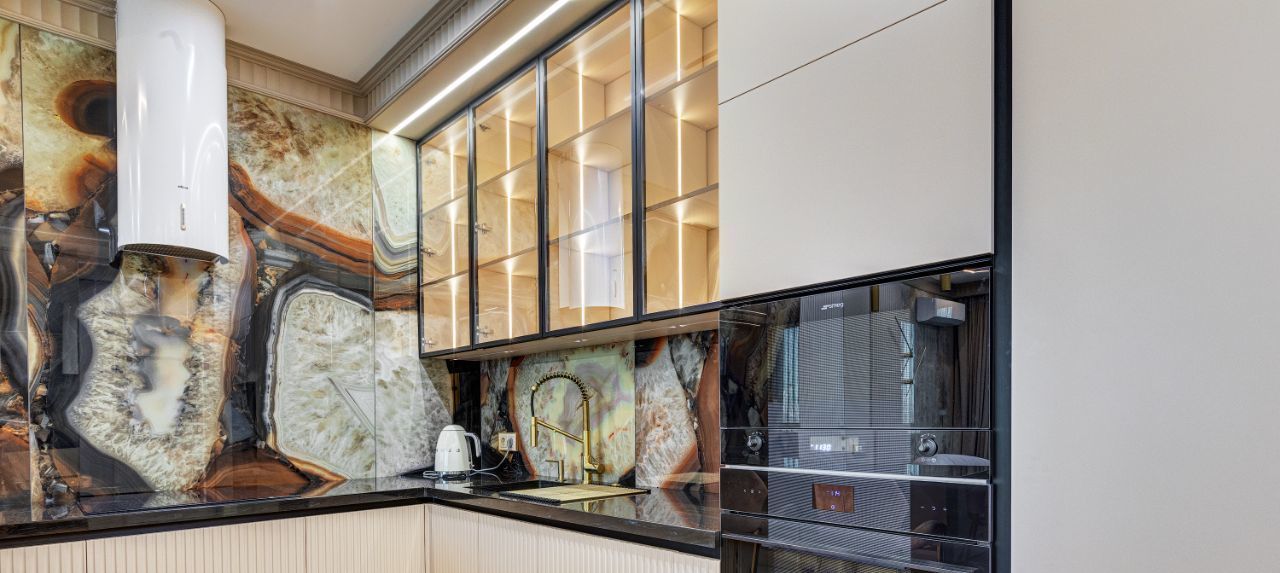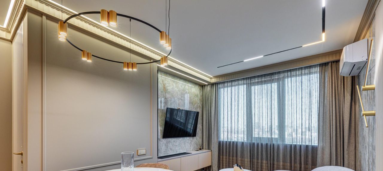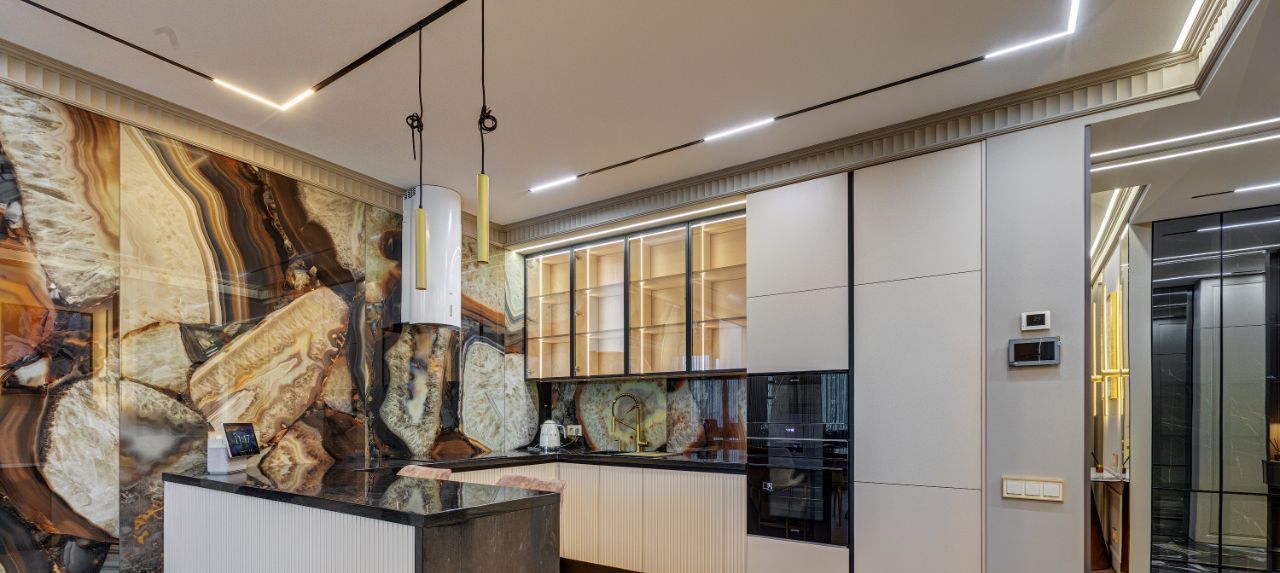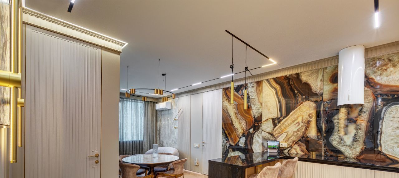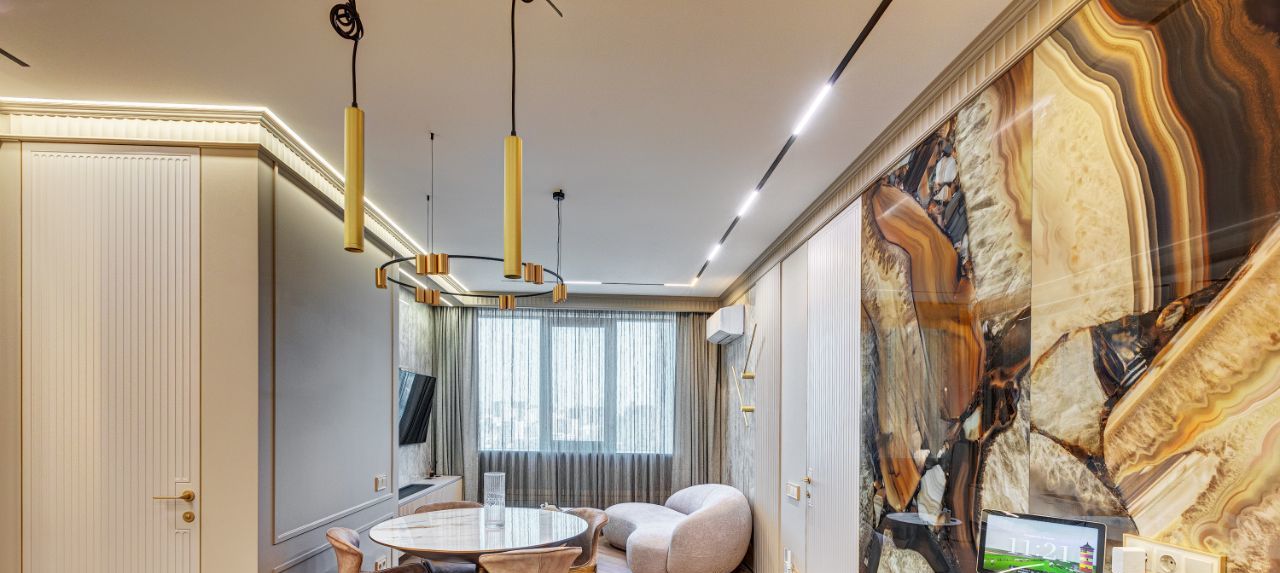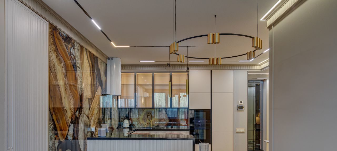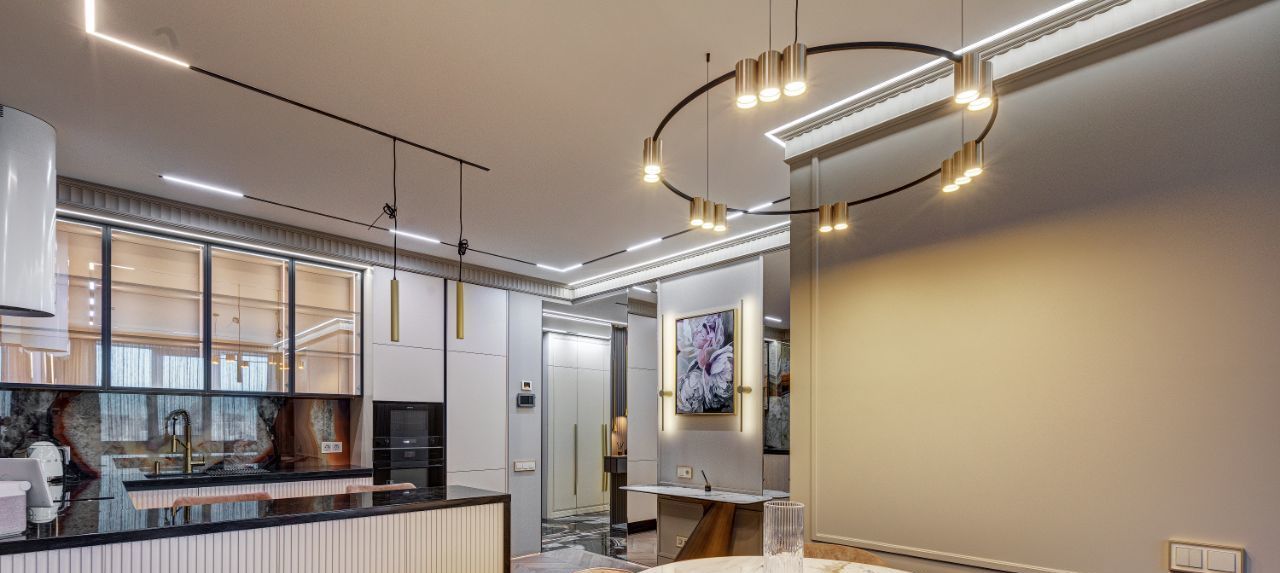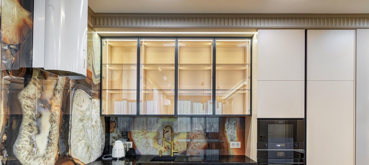 В кухне установлена узнаваемая во всем мире итальянская техника SMEG. Мебель выполнена по чертежам дизайнера на заводе известной мебельной фабрики Mr. Doors, с многолетним опытом работы. Мягкая мебель представлена премиальным российским брендом Oprime. Трековое освещение смонтировано в смарт-системе известного бренда DENKIRS, что включает несколько сценариев освещения от теплого до холодного.