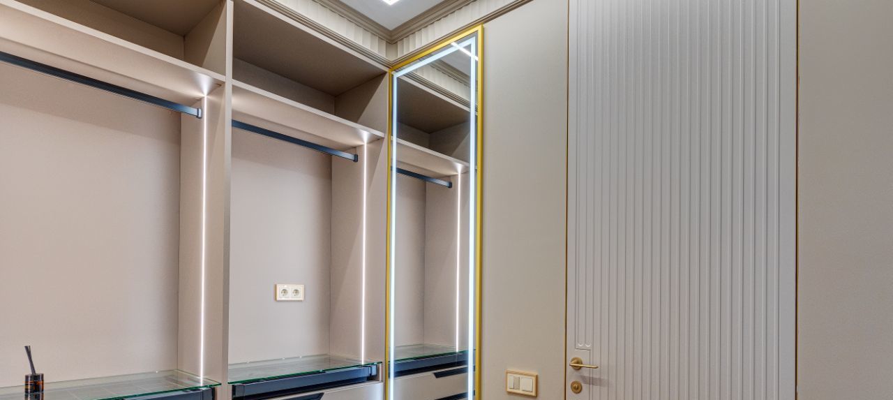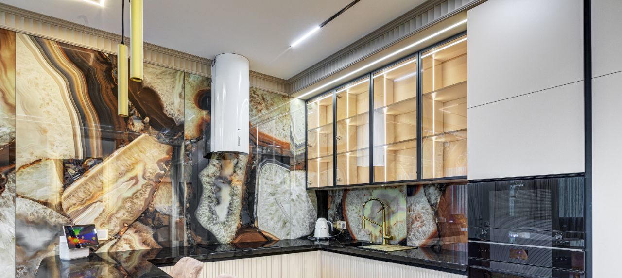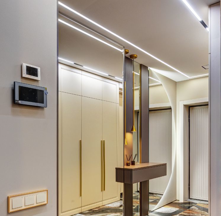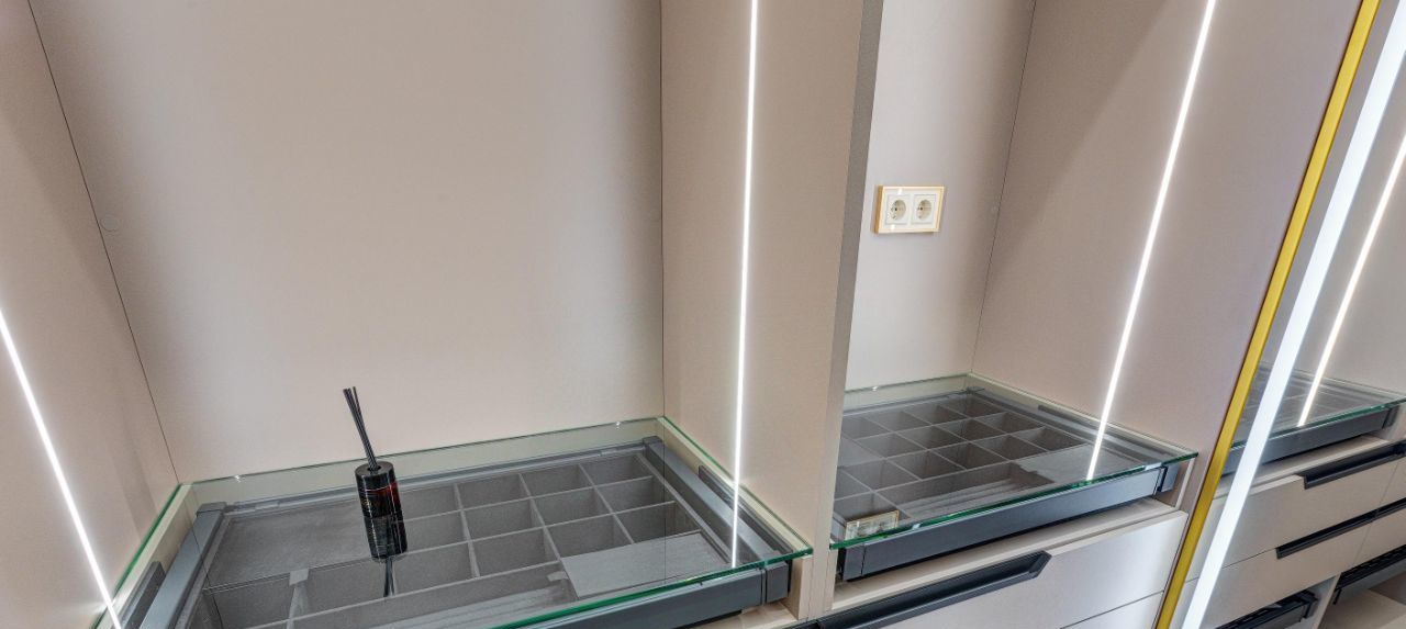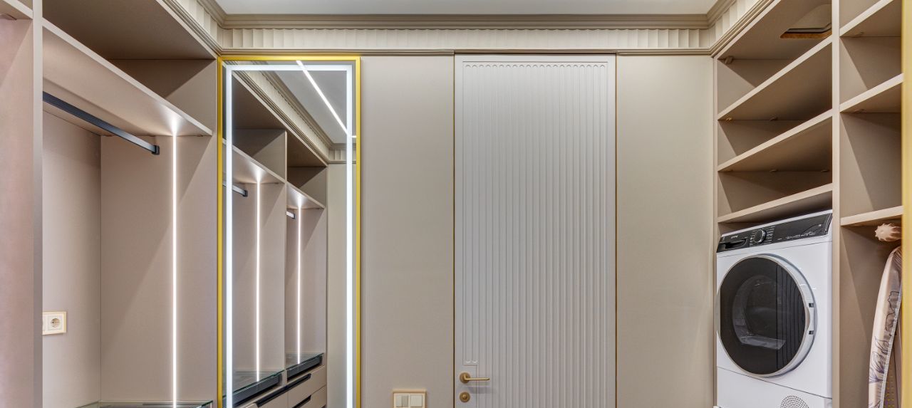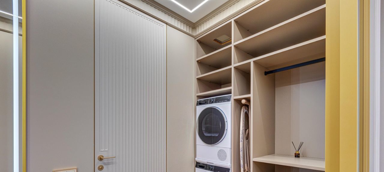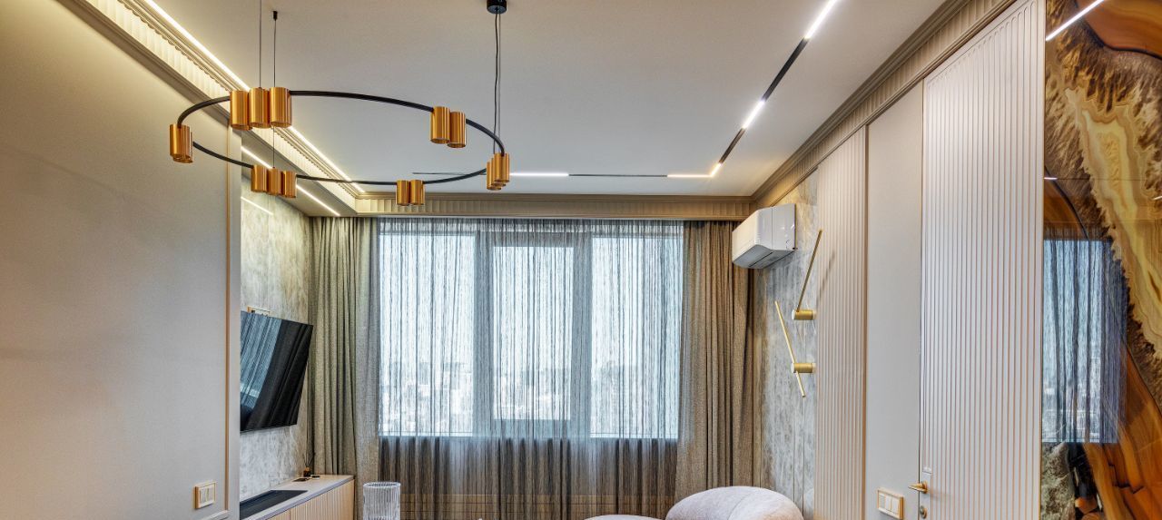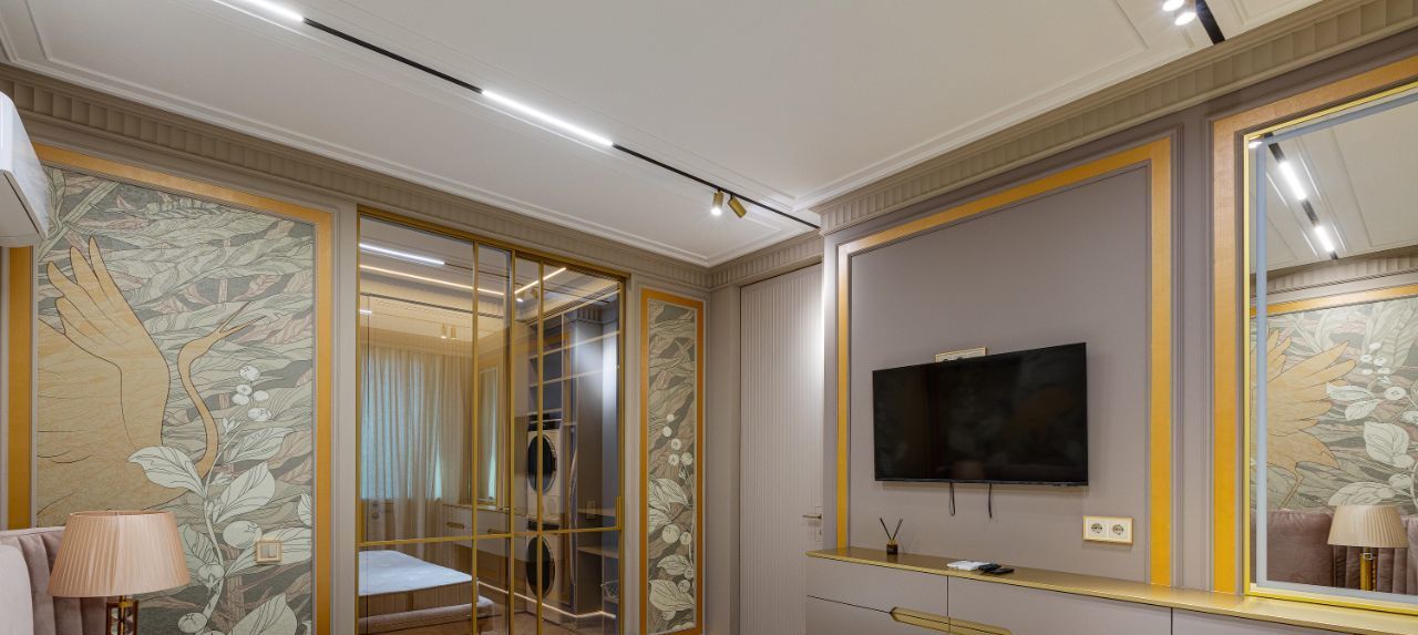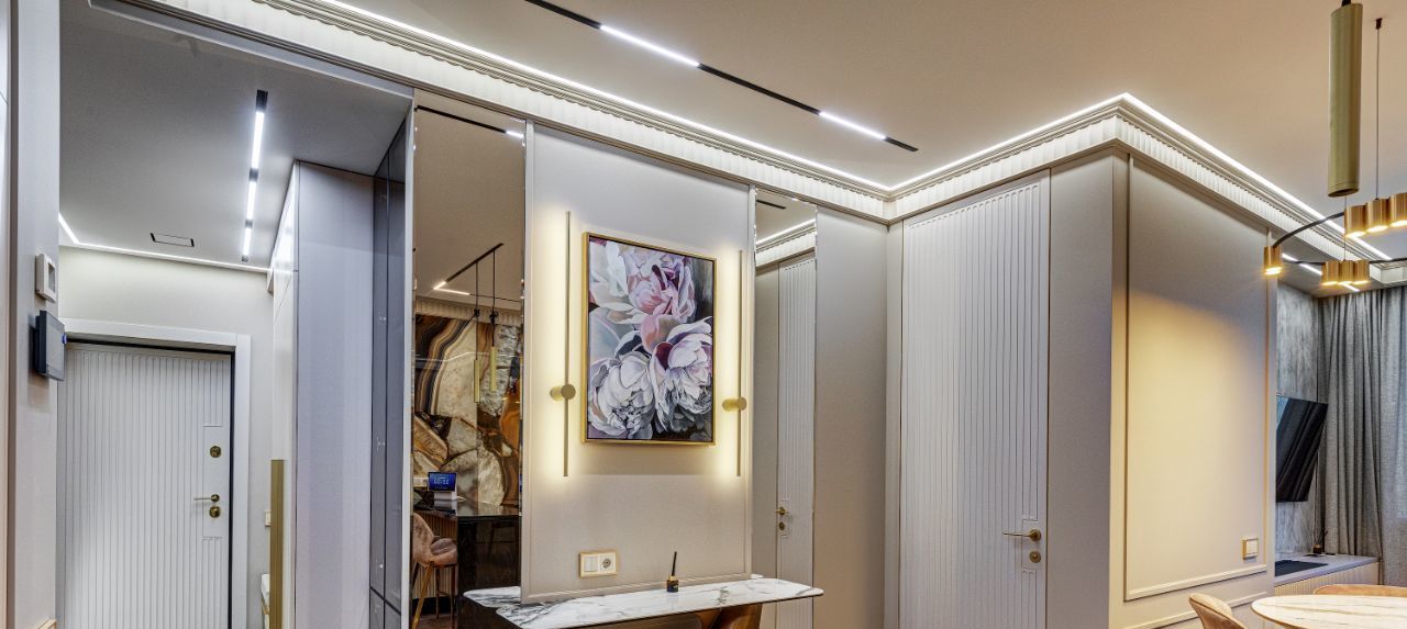 В кухне установлена узнаваемая во всем мире итальянская техника SMEG. Мебель выполнена по чертежам дизайнера на заводе известной мебельной фабрики Mr. Doors, с многолетним опытом работы. Мягкая мебель представлена премиальным российским брендом Oprime. Трековое освещение смонтировано в смарт-системе известного бренда DENKIRS, что включает несколько сценариев освещения от теплого до холодного.