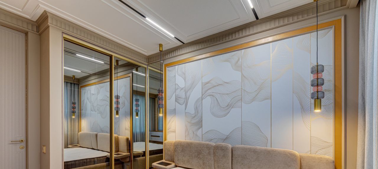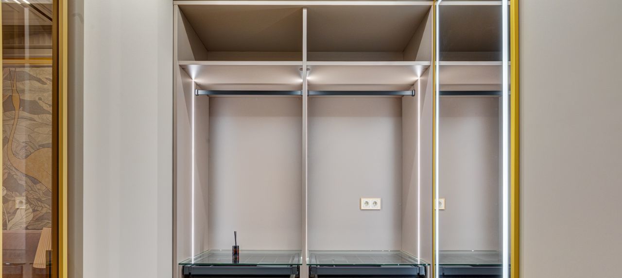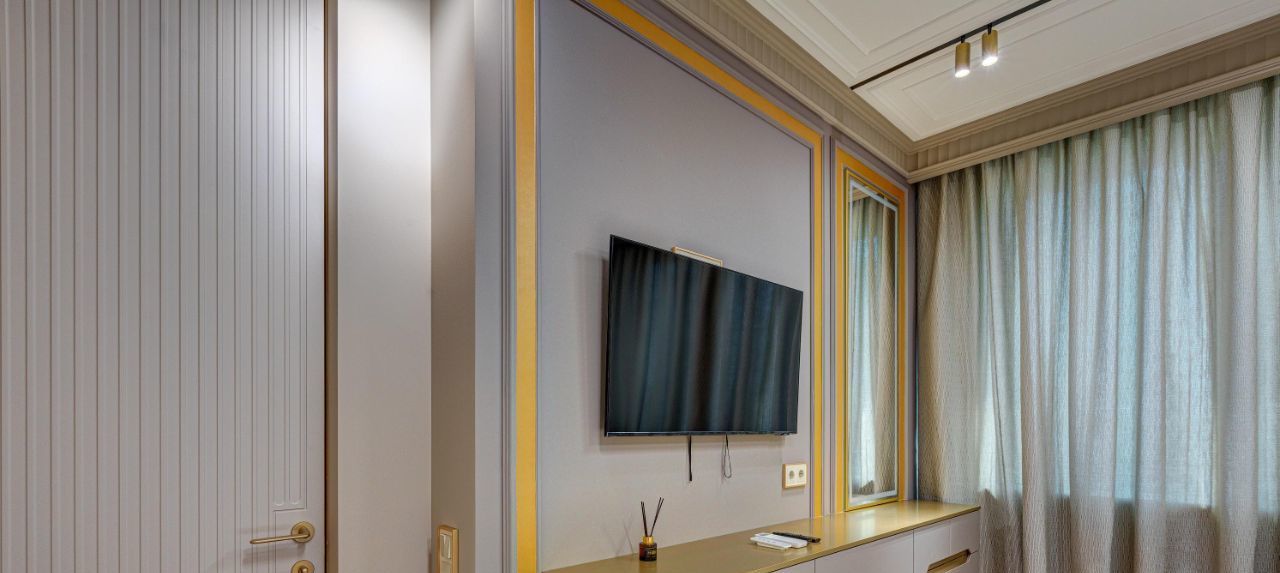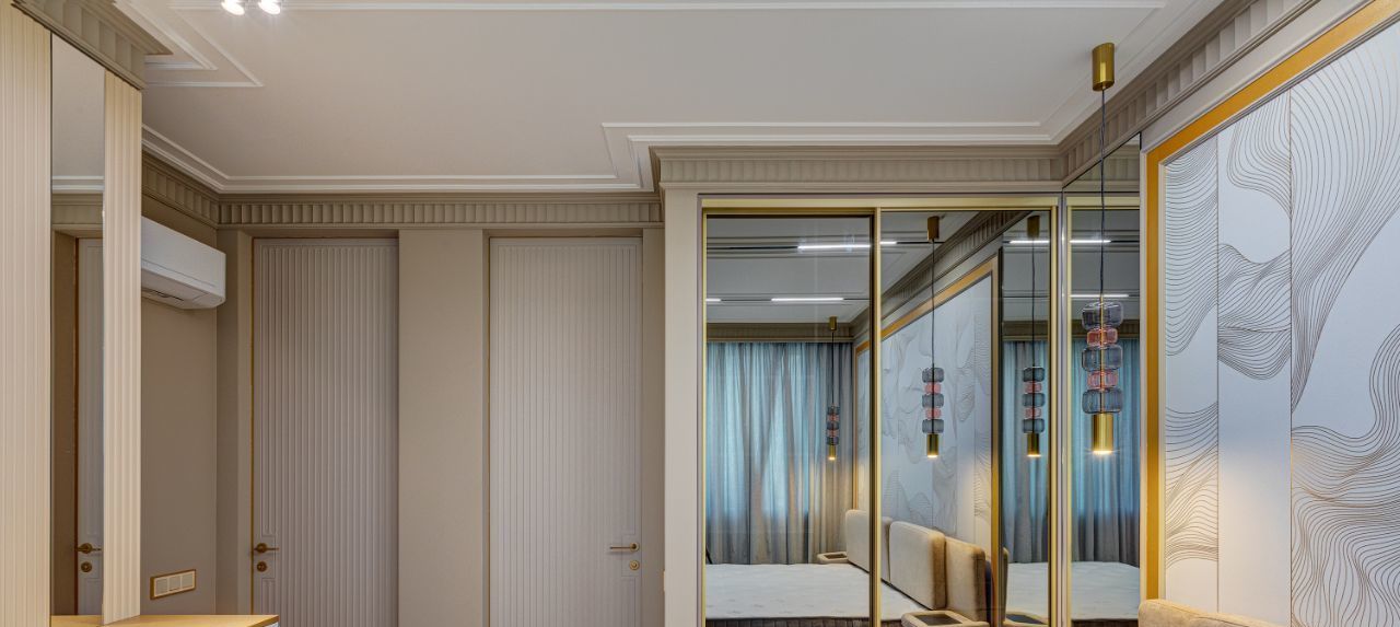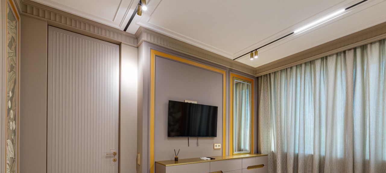 Особое внимание уделено тишине и комфорту: стены дополнительно отделаны акустическим гипсокартоном Knauf, окрашены в английскую краску Little Greene, дополнены карнизами и молдингами из натуральной гипсовой лепнины. Акцентом спален сделаны фрески от известного бренда Afresco.