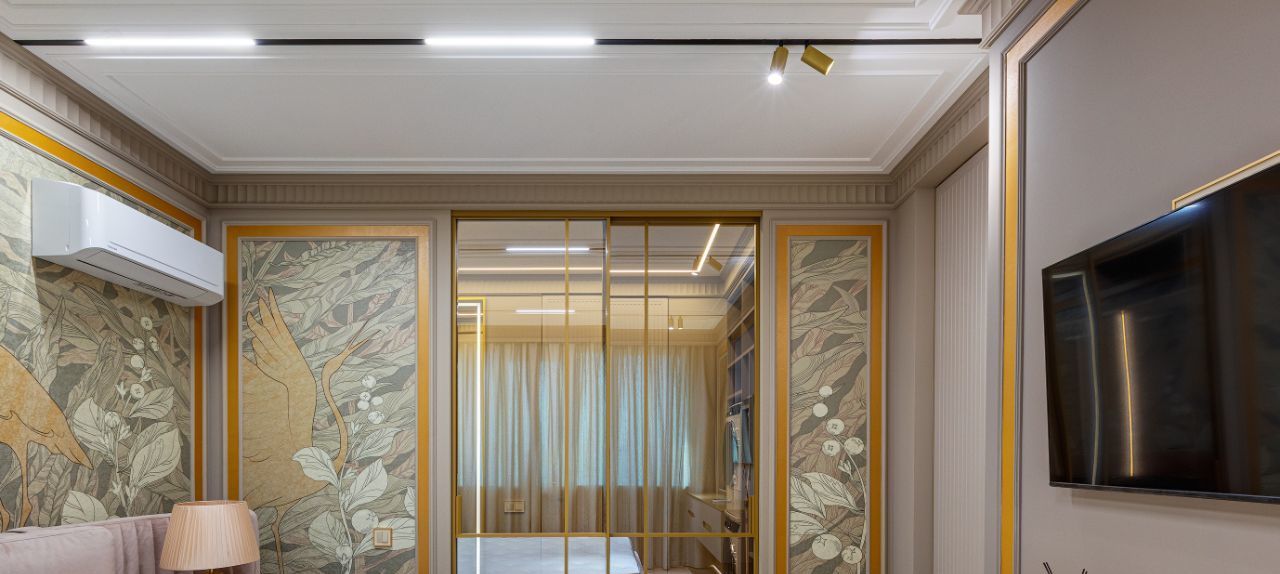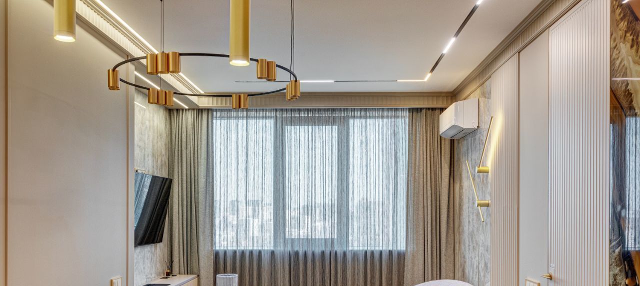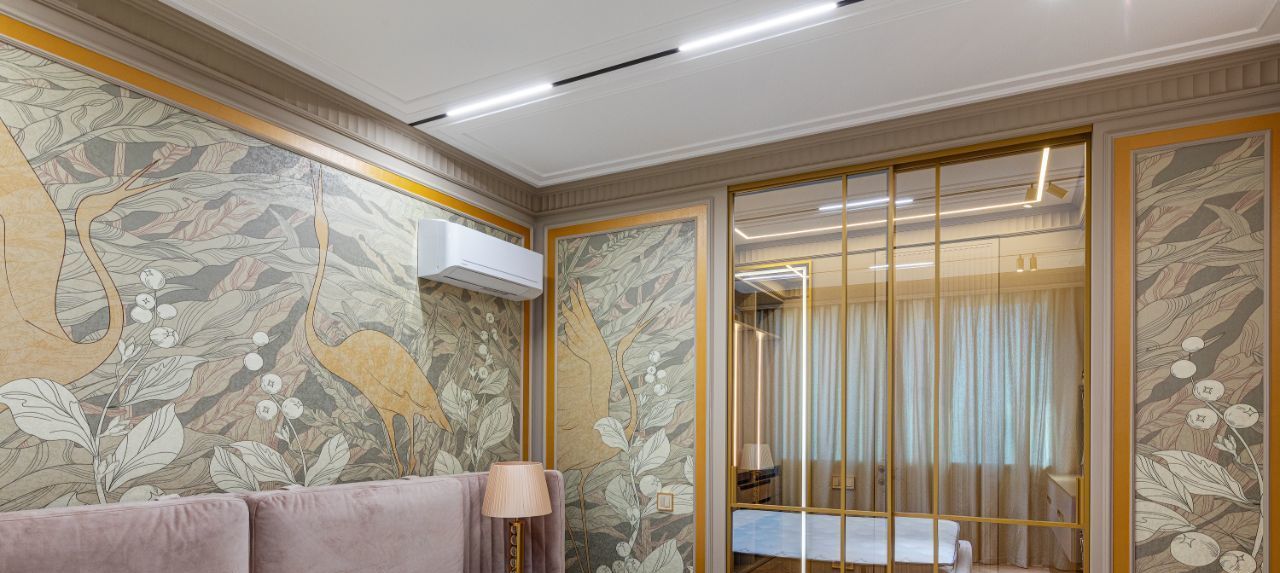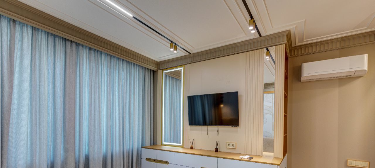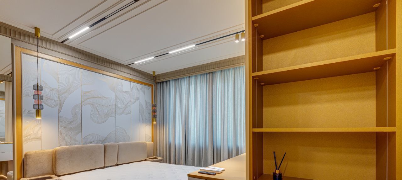Особое внимание уделено тишине и комфорту: стены дополнительно отделаны акустическим гипсокартоном Knauf, окрашены в английскую краску Little Greene, дополнены карнизами и молдингами из натуральной гипсовой лепнины. Акцентом спален сделаны фрески от известного бренда Afresco.