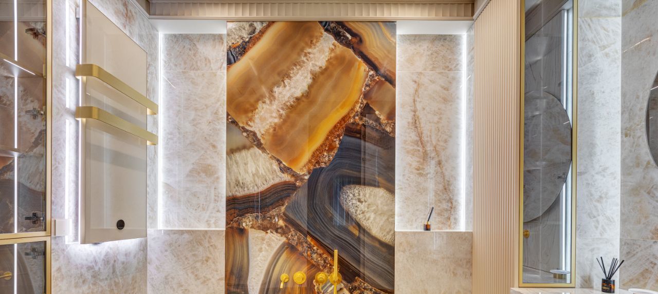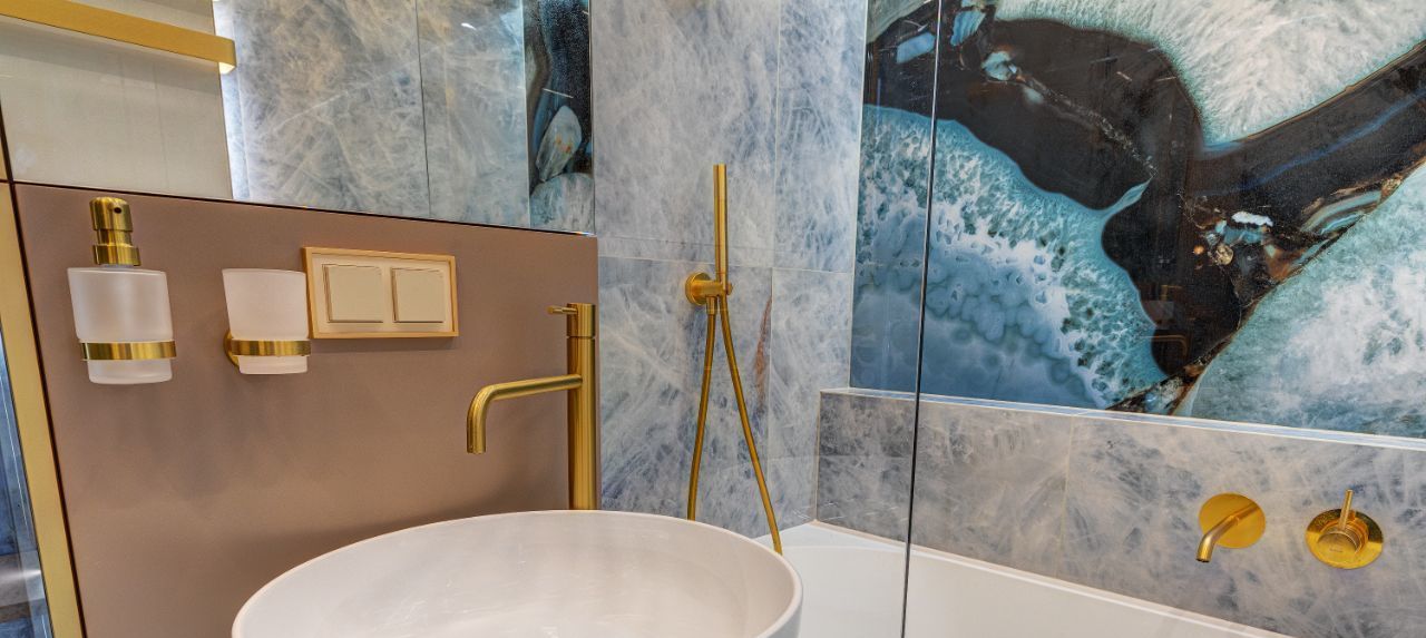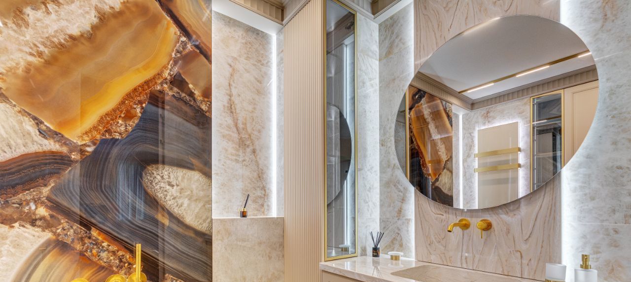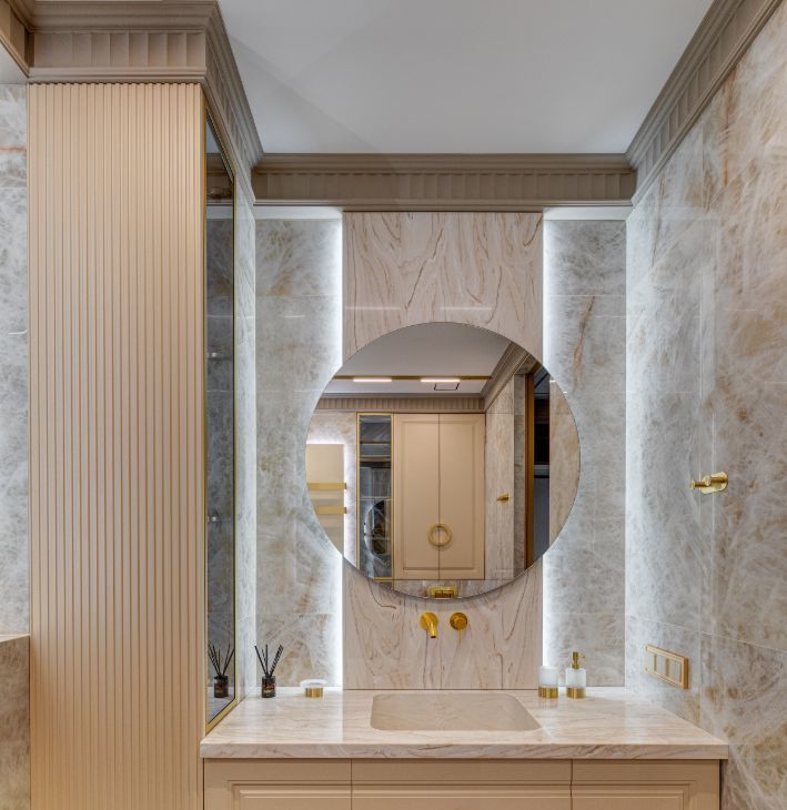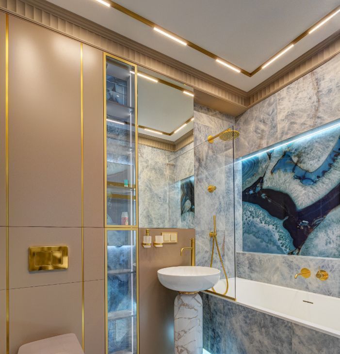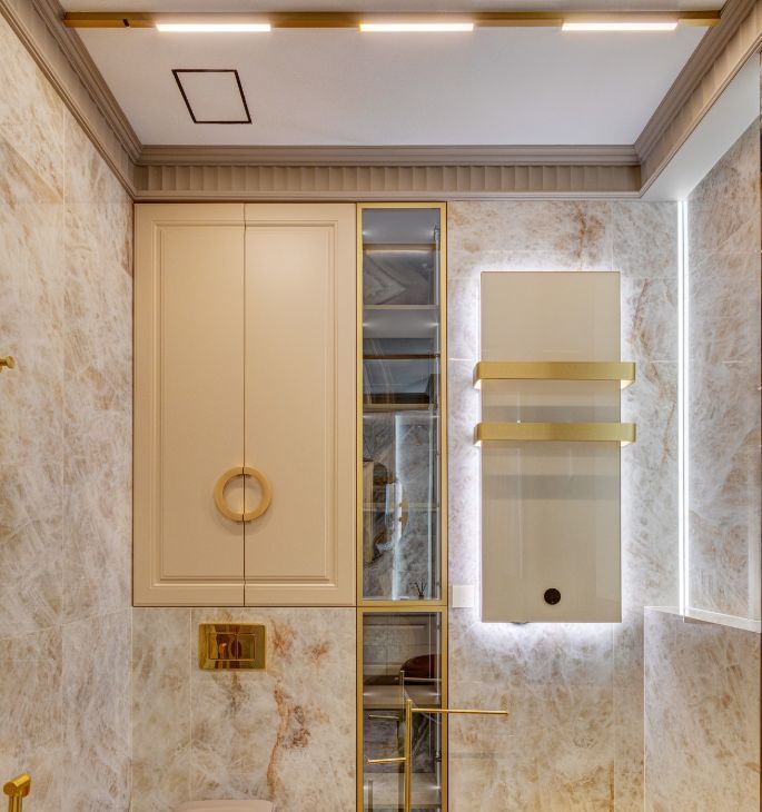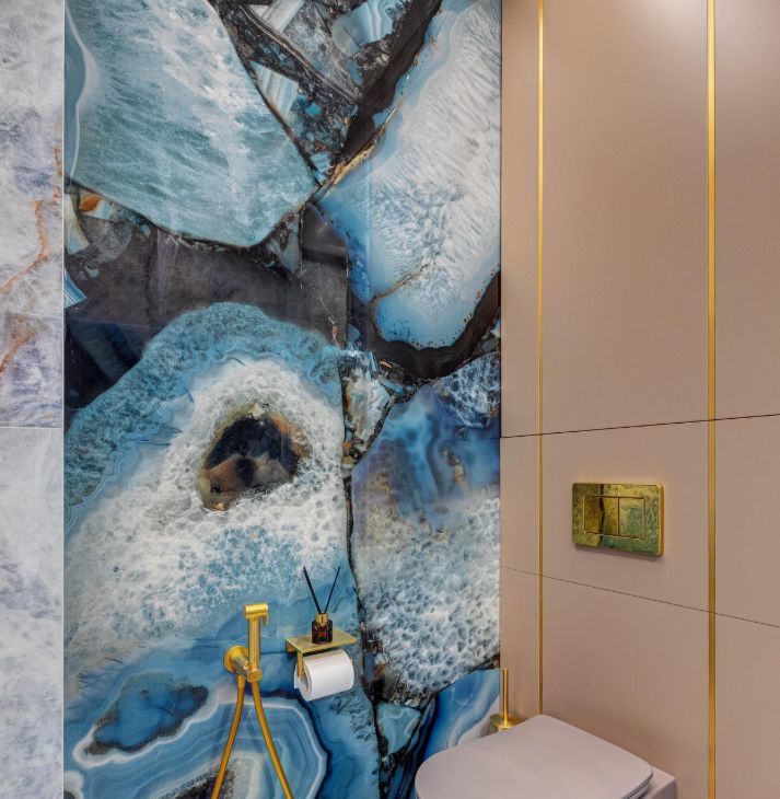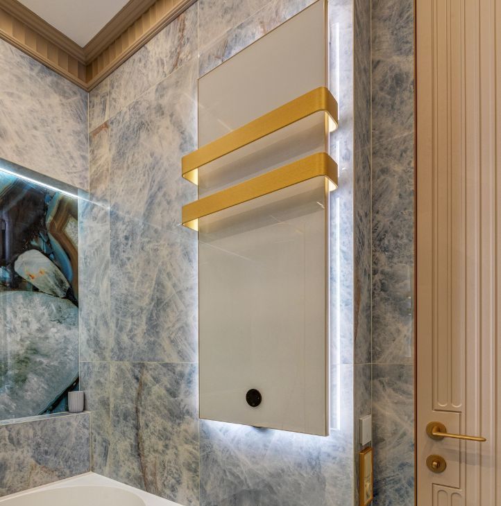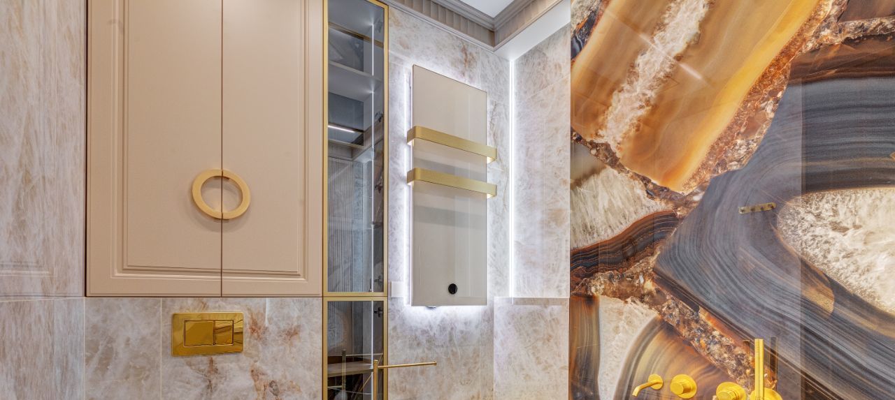 В интерьера использованы современные, экологичные материалы. На полу - инженерная доска Coswick, на стенах в санузлах и кухне-гостиной итальянский керамогранит Emil Ceramica коллекции Tele di Marmo Precious, установлена премиальная итальянская сантехника Artceram, Salini, Kerasan и Abber. Смесители и душевые системы выбраны от REMER - крупного итальянского производителя смесителей, кранов и сантехнического оборудования.