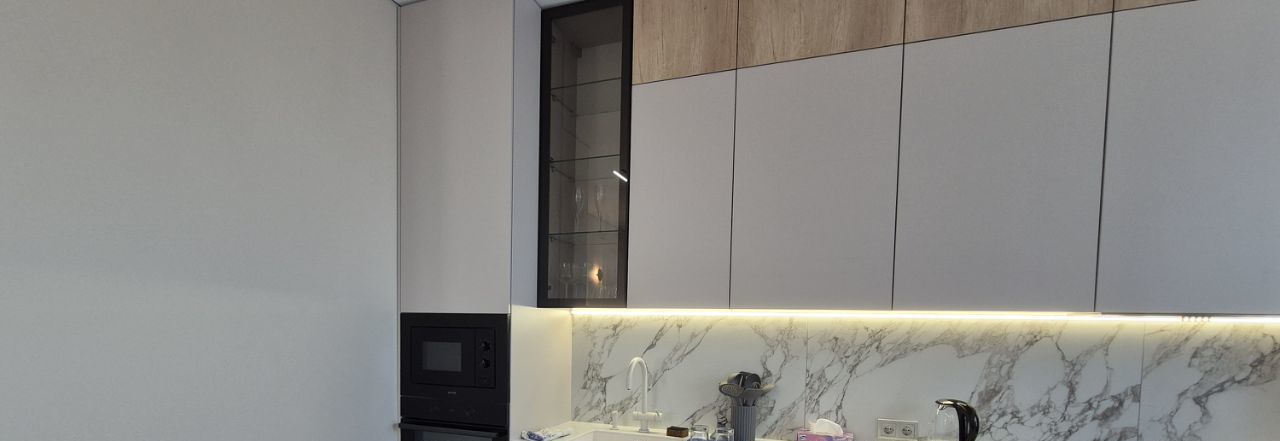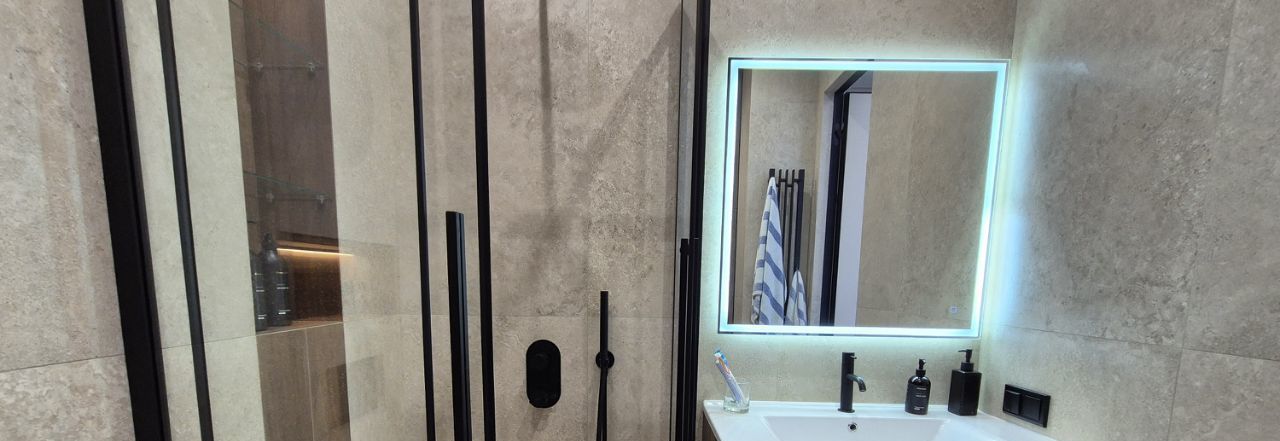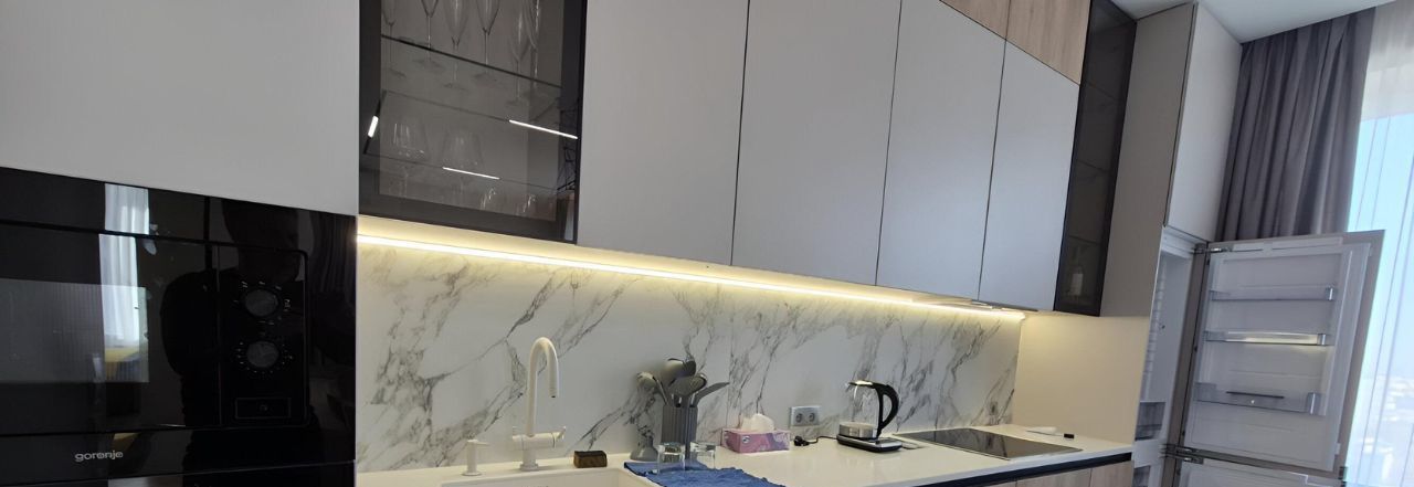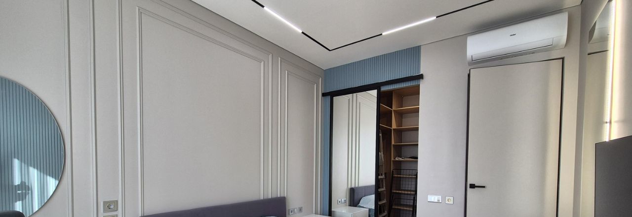 В квартире сделан дизайнерский ремонт, что создает уютную и современную атмосферу. Кухня полностью оборудована мебелью и техникой, включая холодильник, посудомоечную машину и кондиционер. В комнатах также есть мебель, а для вашего удобства — телевизор и стиральная машина. Ванная комната оснащена душевой кабиной, что добавляет комфорта вашему проживанию.