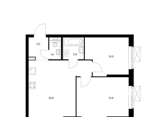 2 жилые комнаты + кухня-гостиная, ванная комната и туалет раздельные.