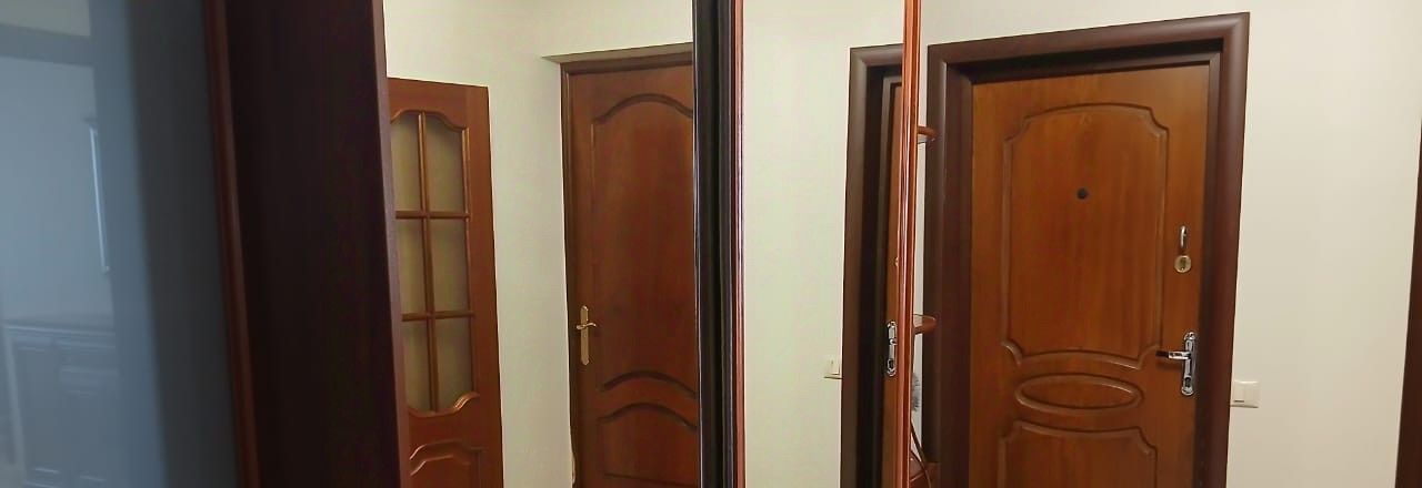 Просторный холл - зеркальный шкаф-купе, пуфик.