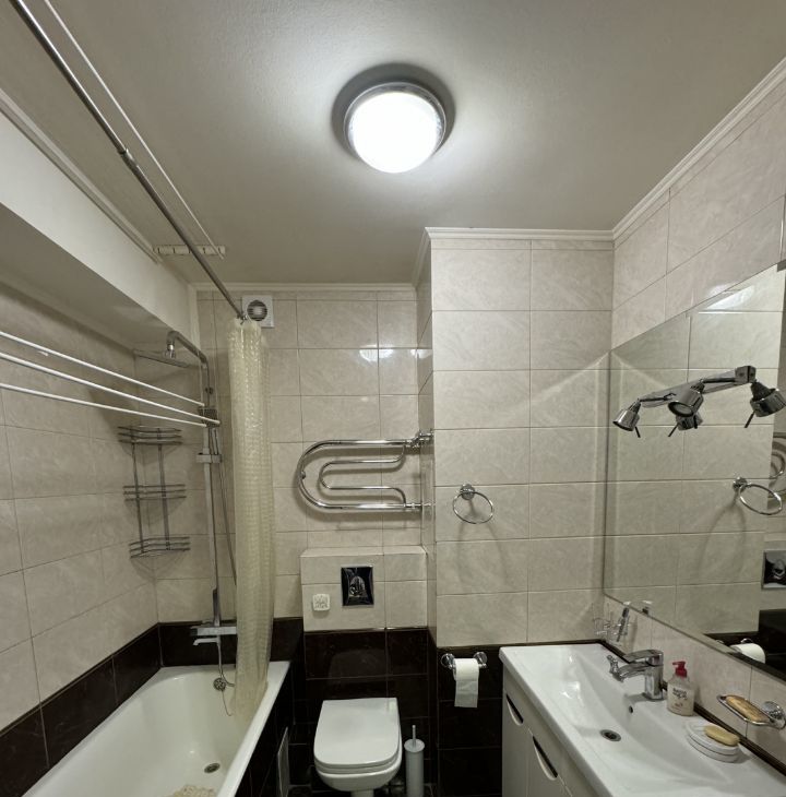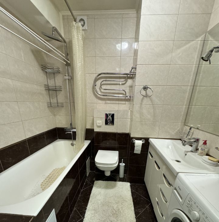 В квартире выполнен косметический ремонт. Просторная жилая площадь составляет 29 кв. м, а кухня — 10 кв. м, где можно с комфортом готовить и проводить время. В квартире есть вся необходимая техника: кондиционер, холодильник, телевизор и стиральная машина, а также мебель на кухне и в комнате. Планировка включает один совмещенный санузел с ванной и один балкон, откуда открывается приятный вид.
