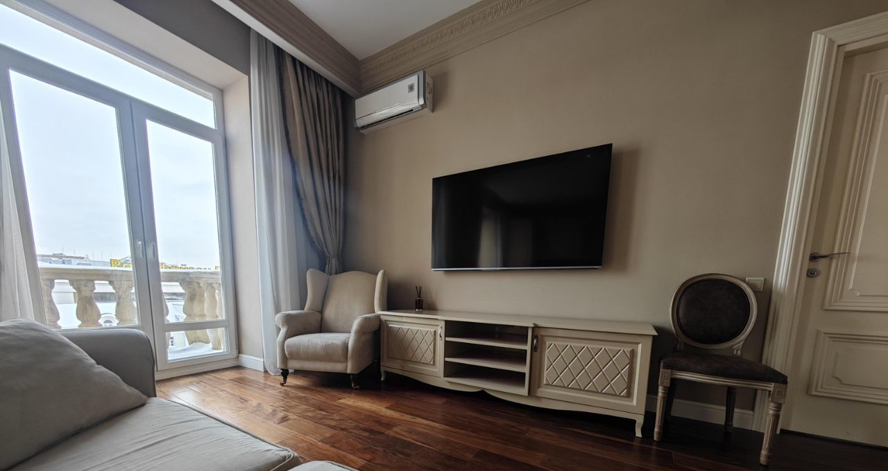Видовая 100% мебелированная 3-комнатная квартира в аренду. Просторная гостиная, изящная спальня с широкими окнами, кухня с полным набором техники, комната с эркером в качестве кабинета или детской, на выбор. На 6-м этаже в монументальной Сталинки с видом на легендарную высотку МИД РФ.