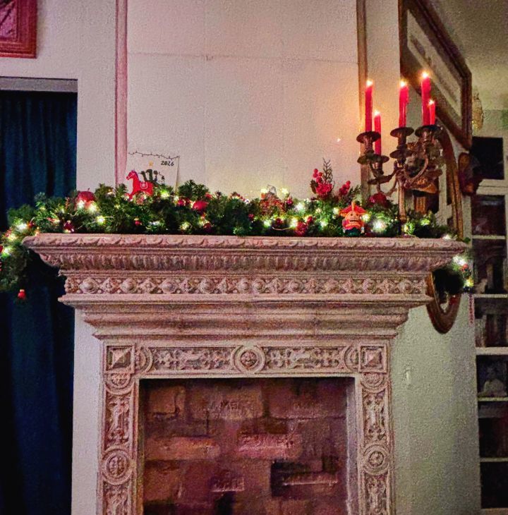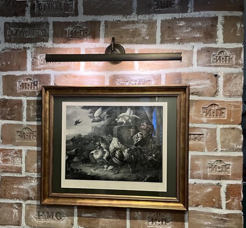 Холл-гостиная с отреставрированным камином XIX века , стены холла и кухни облицованы подлинным клейменым кирпичом XIX века.