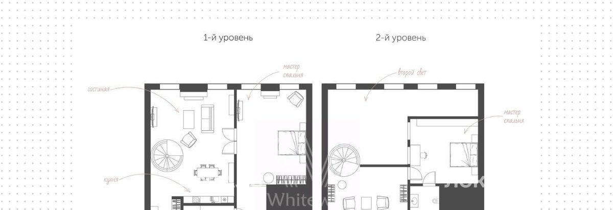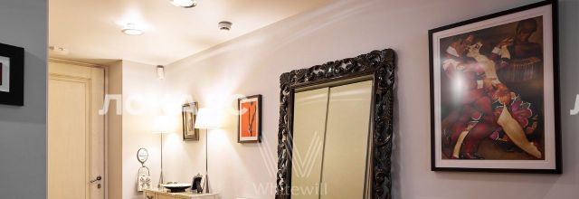 На 1-м уровне спланирована кухня-гостиная с обеденной зоной, мастер-спальня с санузлом, прихожая. На втором уровне расположены комната отдыха в китайском стиле со старинными восточными литографиями и кабинет, который можно использовать как вторую спальню, с ванной комнатой. Квартира полностью укомплектована эксклюзивной мебелью Armani, Provasi и Ego, ковры Marni. А так же, оборудована бытовой техникой Kuppersbusch, TV Sony, кондиционеры Daikin.