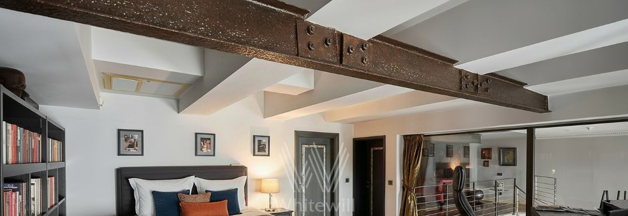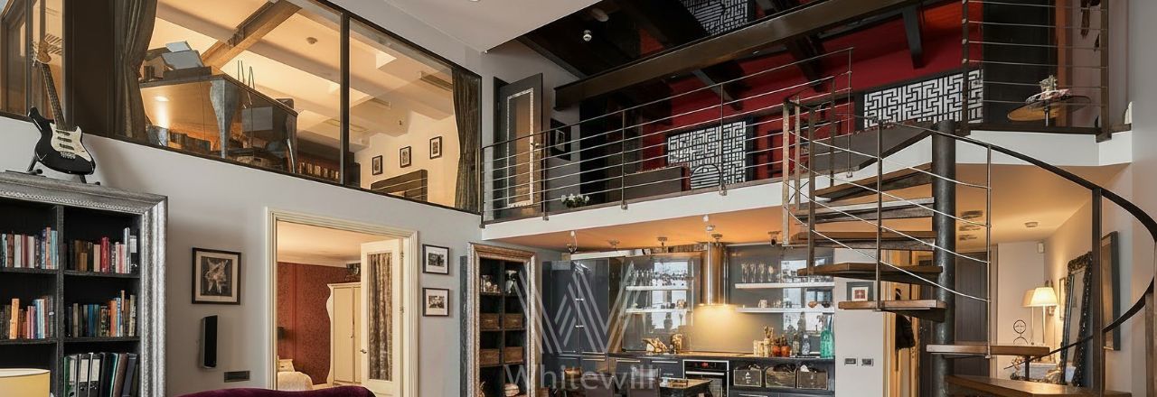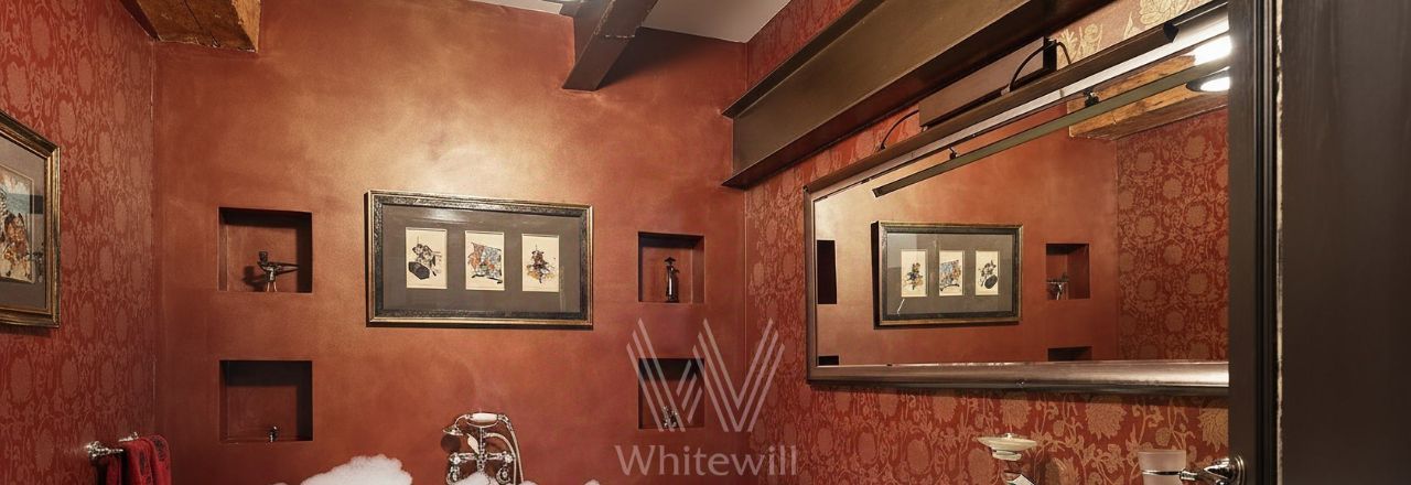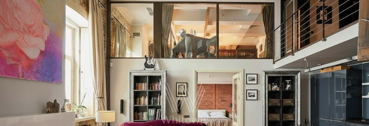 Бонус партнёрам 50%. Двухуровневая квартира с 2-мя спальнями общей площадью 152 м² в отреставрированном особняке в переулке Арбата. Квартира расположена на 3-м этаже. Выполнен дизайнерский ремонт в авторском стиле. Полы выложены натуральным орехом, часть стен оформлена открытой кирпичной кладкой, в гостиной и спальне установлены действующие камины. Благодаря потолку высотой 6 метров и большим окнам пространство наполнено естественным светом и воздухом.