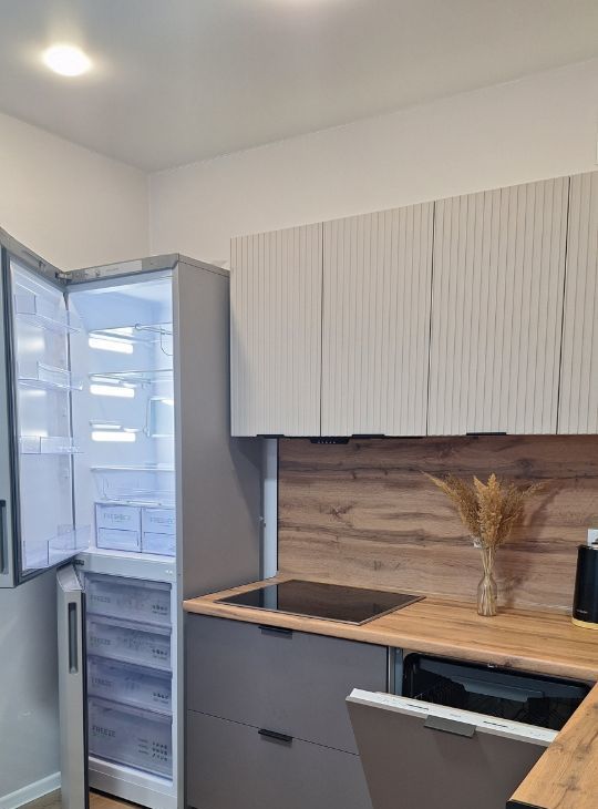 Просторная и светлая кухня-гостинная оснащена всей необходимой мебелью и техникой: есть холодильник и посудомоечная машина.