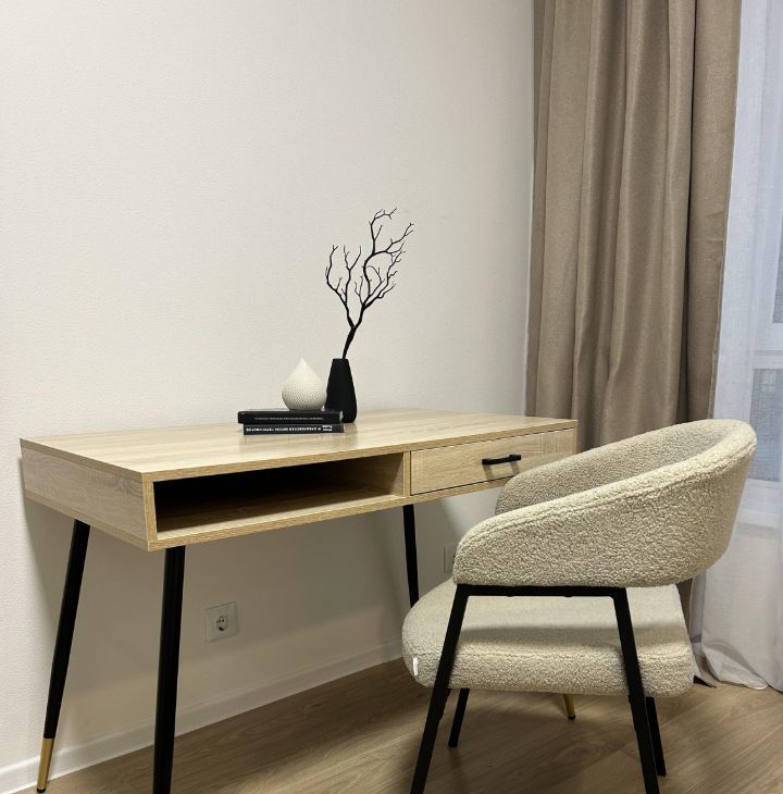 Кабинет: раскладной диван (может использоваться как полноценное спальное место), рабочий стол со стулом, вместительный шкаф для хранения вещей, напольный торшер. Помещение легко переоборудовать в детскую комнату или дополнительную спальню.