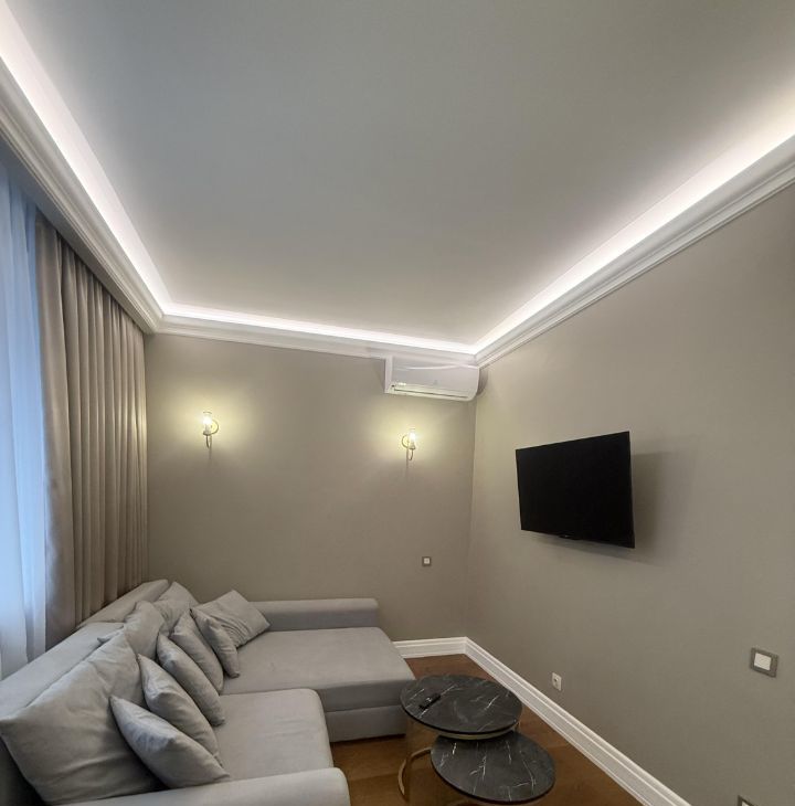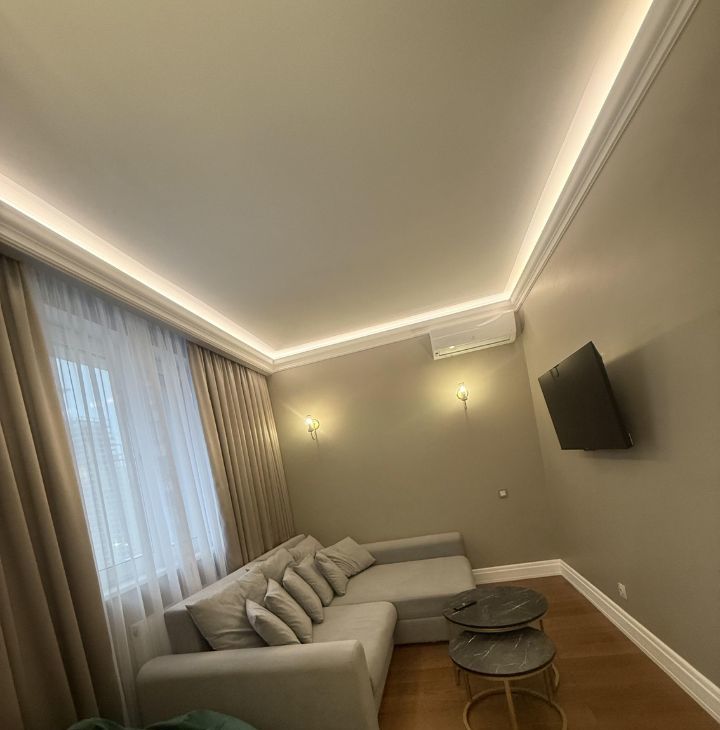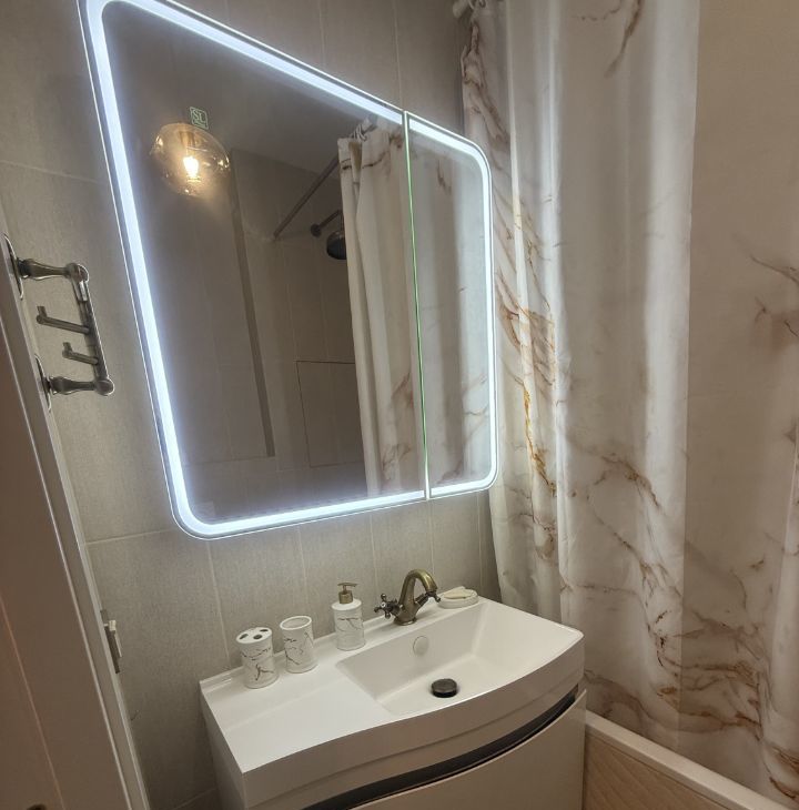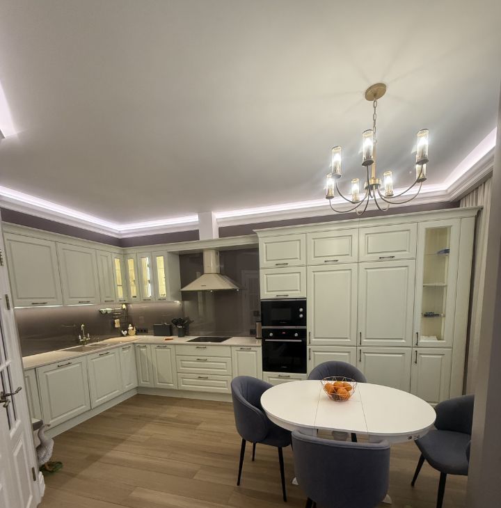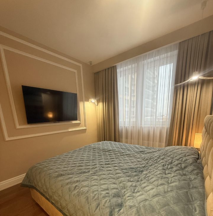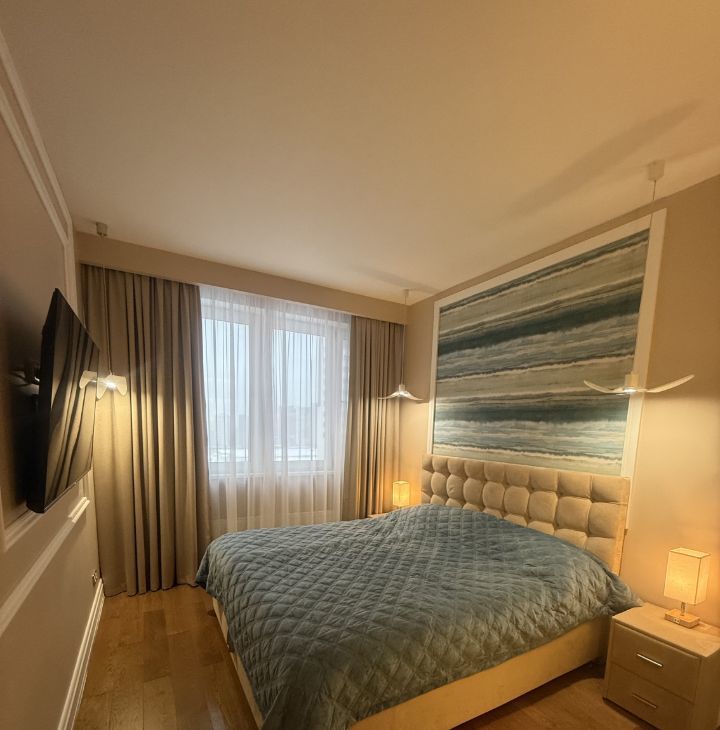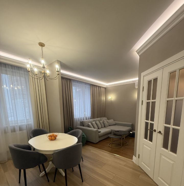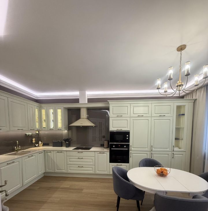 В квартире сделан качественный дизайнерский ремонт (все материалы импортные). Есть вся необходимая мебель и техника для комфортного проживания: встроенный холодильник, встроенные духовка и микроволновка, электрическая варочная панель, встроенная посудомоечная машина, измельчитель отходов в раковине, выхлопов. На кухне