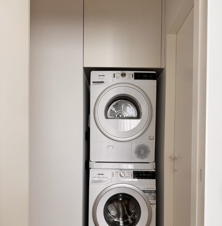 Есть отдельная зона со стиральной и сушильной машинами. Совмещенный с/у.