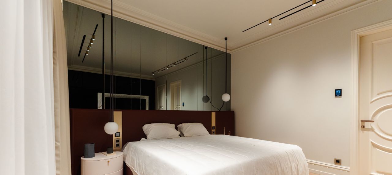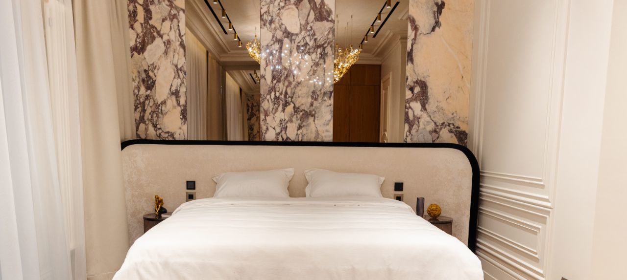 Спальни: Главная спальня с индивидуальной мебелью, лепниной и мраморным панно Breccia Capraia. Вторые спальни не уступают по уровню отделки, с дубовыми полами Coswick и дизайнерскими светильниками Vibia и Yephall.