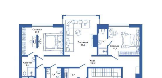 Просторная планировка: 3 спальни, современная гостиная-столовая.