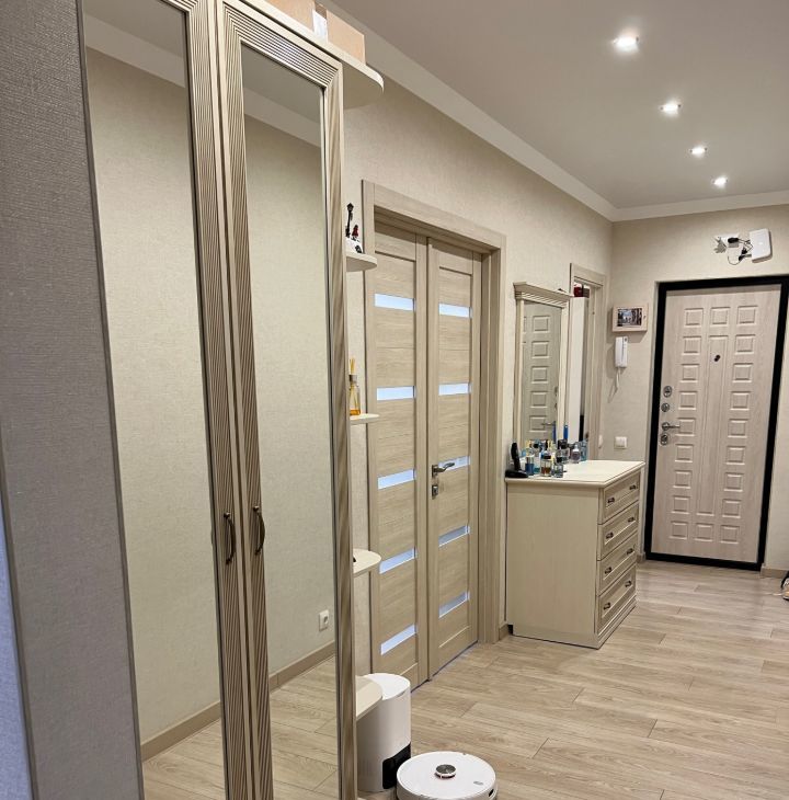 В квартире есть робот-пылесос, холодильник, телевизор, миковоловая печь,сира машина.