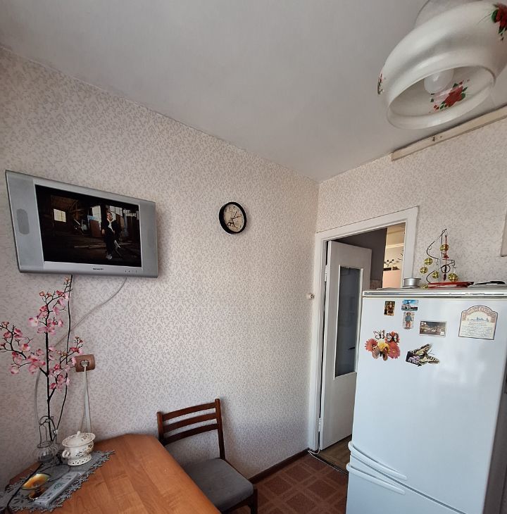 Техника: Холодильник, стиральная машина, чайник и телевизор на кухне.