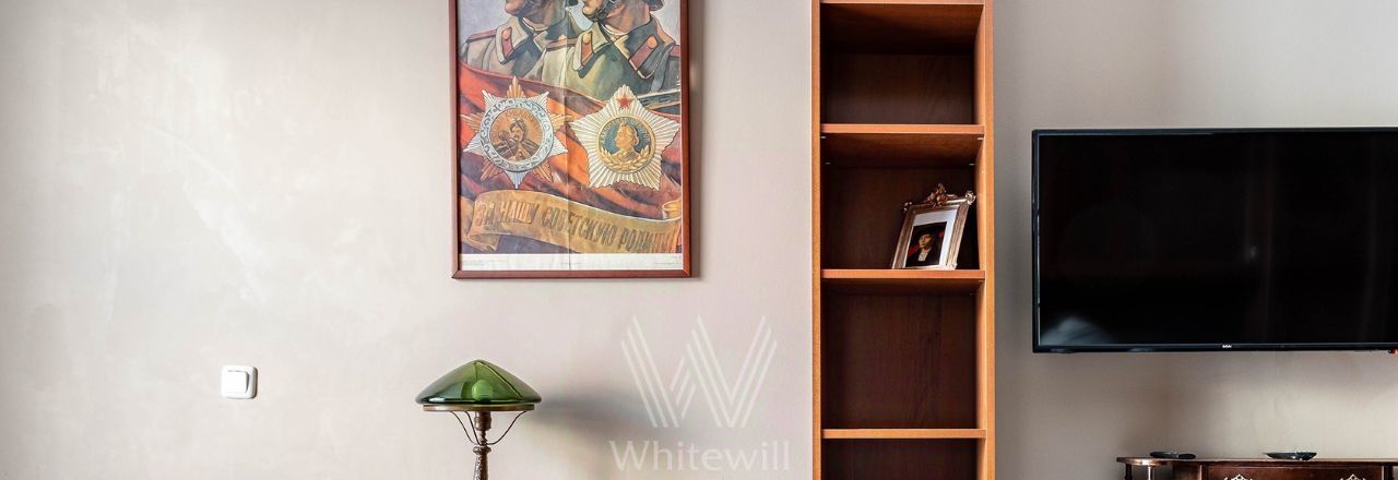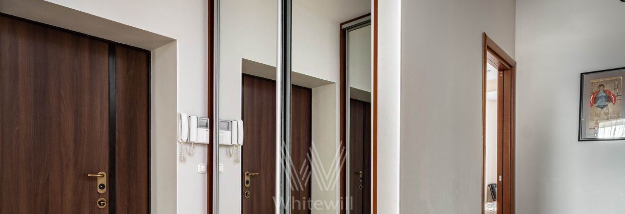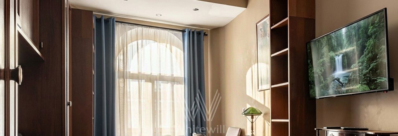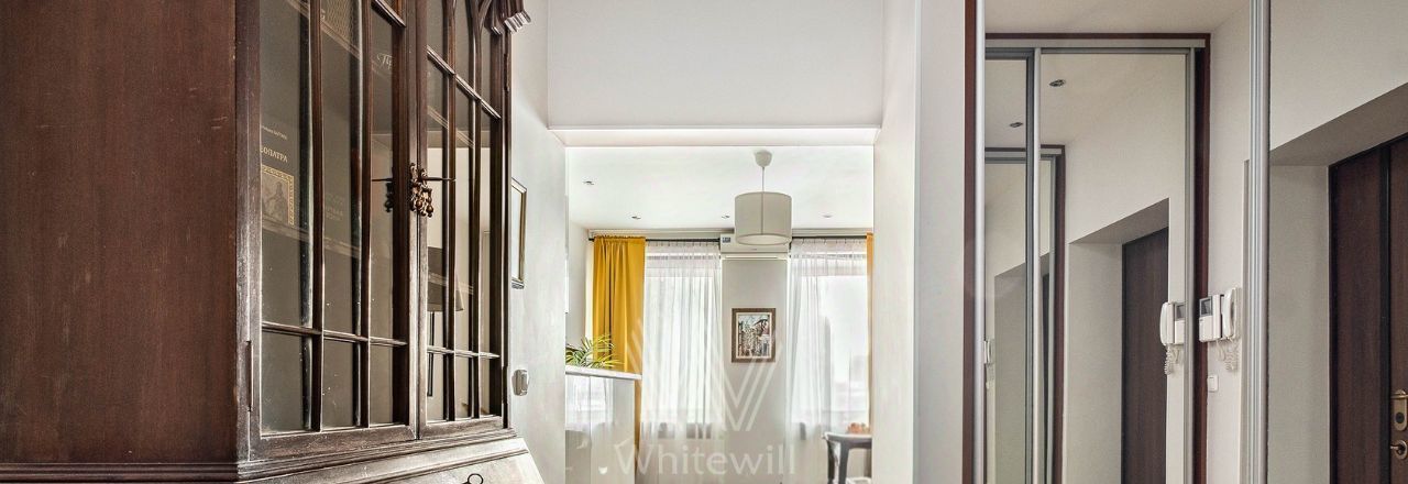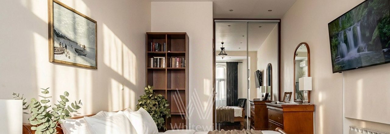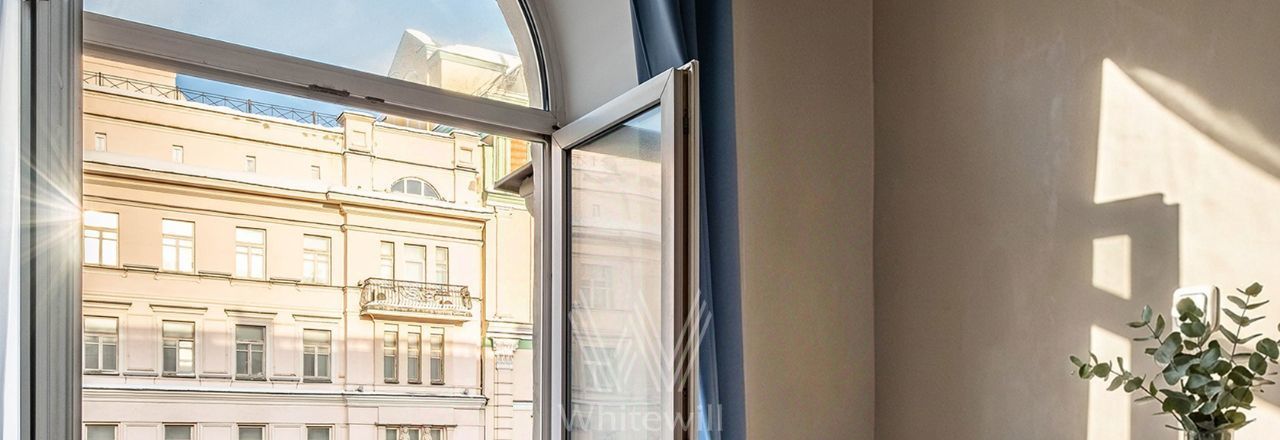 Квартира с двумя спальнями общей площадью 69 м² в доме на Тверской. Лаконичный интерьер оформлен в светлых тонах. Спланирована кухня-гостиная, спальня, кабинет с диваном и письменным столом, выход на балкон, прихожая с гардеробом. Ванная комната с гидромассажной ванной, сантехника Villeroy & Boch. Квартира укомплектована мебелью и техникой. В спальне установлена двуспальная кровать, кресло с оттоманкой, шкаф и комод. В каждой комнате — телевизор. Из окон открывается вид на Тверскую улицу. Предусмотрено одно машино-место во дворе.