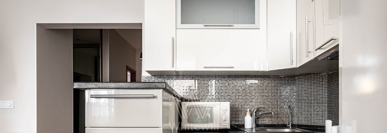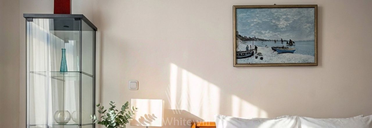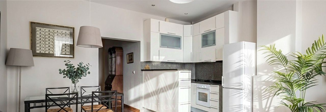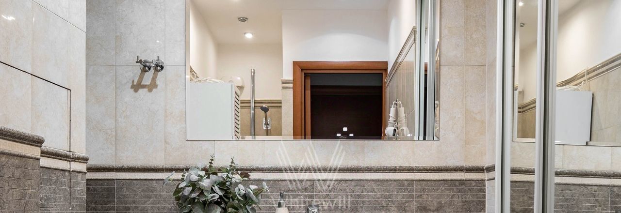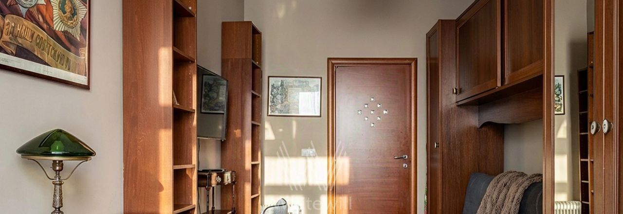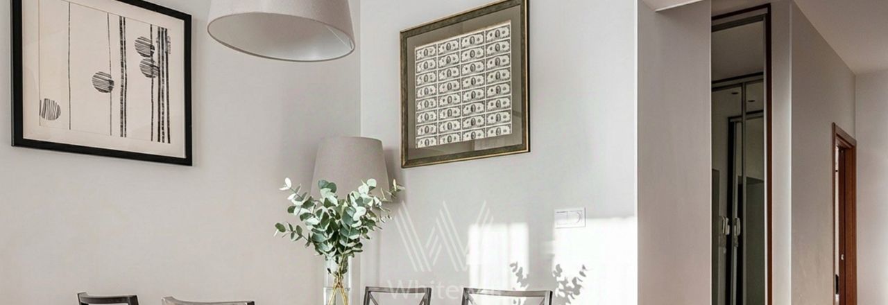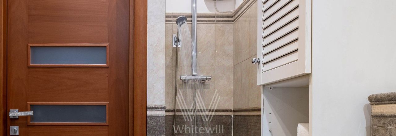 Квартира с двумя спальнями общей площадью 69 м² в доме на Тверской. Лаконичный интерьер оформлен в светлых тонах. Спланирована кухня-гостиная, спальня, кабинет с диваном и письменным столом, выход на балкон, прихожая с гардеробом. Ванная комната с гидромассажной ванной, сантехника Villeroy & Boch. Квартира укомплектована мебелью и техникой. В спальне установлена двуспальная кровать, кресло с оттоманкой, шкаф и комод. В каждой комнате — телевизор. Из окон открывается вид на Тверскую улицу. Предусмотрено одно машино-место во дворе.